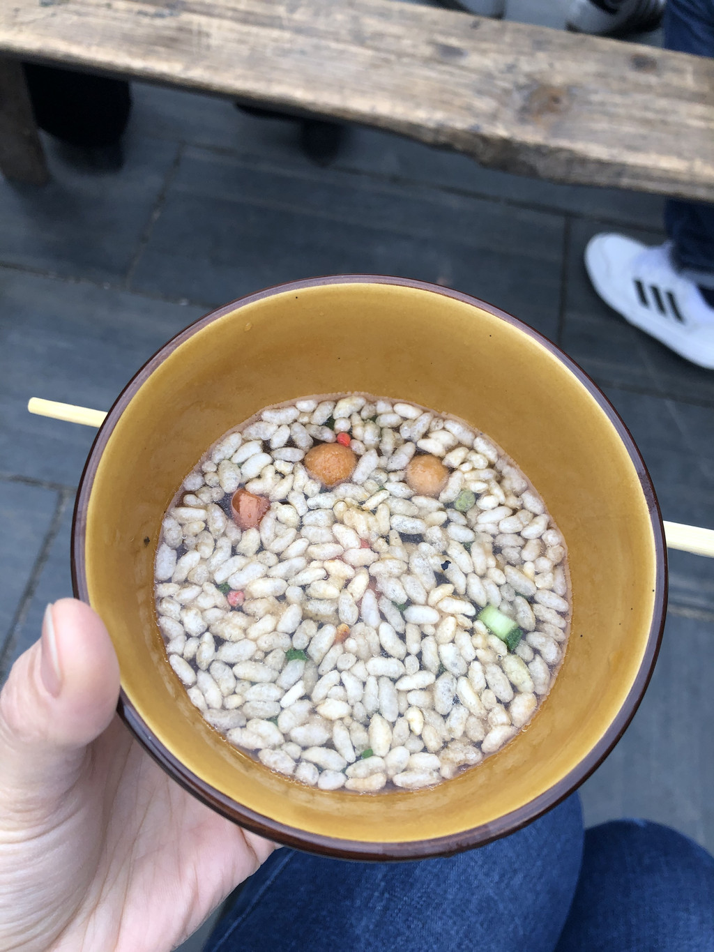 观看侗族妹子们的表演,感受她们日常的劳作。今天的天气还算晴朗,不算冷。但是没有太阳,来一碗油茶,让人心里特别温暖。