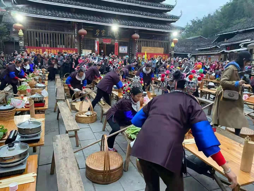 喝完油茶,看完表演。就到了百家宴的用餐时间啦!由于套餐内只有长桌宴,我们这次来的巧,可以每个人加5元就可以享受侗族的百家宴啦!