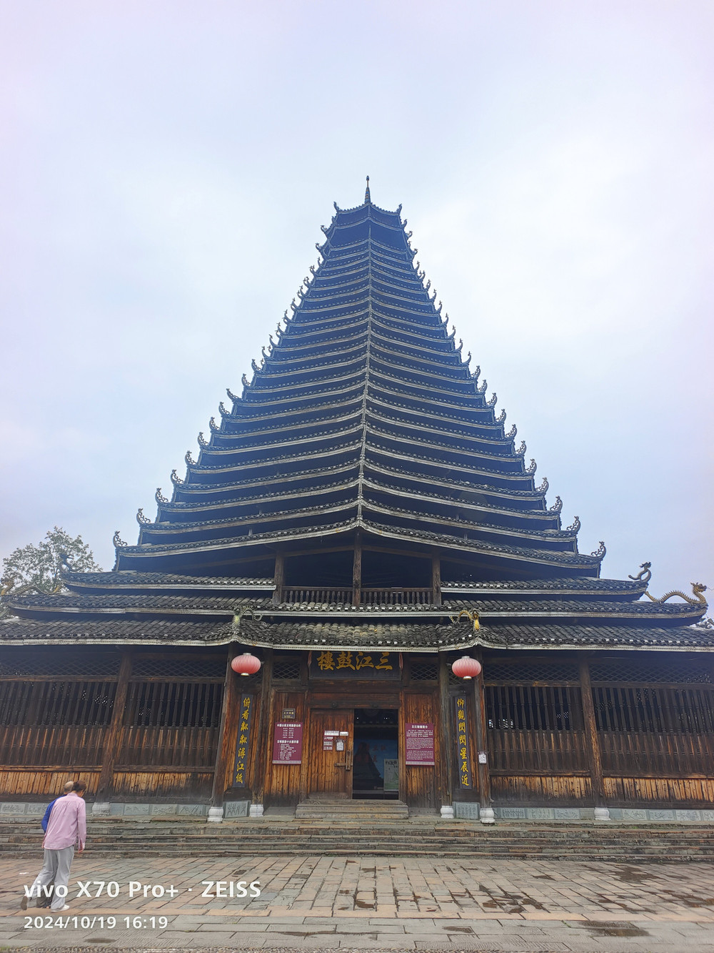 三江多耶广场有三江标志性建筑三江鼓楼,于2002年11月由当地著名的侗族民间工匠杨似玉为首的民间楼桥师傅队伍携手建造而成,集文化、观赏、旅游等多项功能于一体。三江鼓楼高42.6米,共有60根柱头着地,占地面积600平方米。鼓楼共有27层瓦檐,除楼顶两层外,其余25层瓦面等距收分,层层紧缩,使楼面呈金字塔形,显得端庄平稳。每层檐角轻盈起翘,精巧的雕饰以及鲜艳的檐板彩绘,与庞大、粗犷的楼身形成鲜明对比。楼内四根杉木大柱直径都超过70厘米,树龄均在百年以上,这在鼓楼建筑史上是唯一的。登上鼓楼的观礼台,三江全景尽收眼底。 鼓楼是侗族村寨的标志和灵魂。三江鼓楼是侗乡第一鼓楼,被誉为“世界第一鼓楼” ,是中国国家4A景区中国三江大侗寨景区的景点,同景区内景点还有三江风雨桥,中国侗城,三江奇石城,福禄寺等。 我们进入鼓楼,观赏里面的鼓楼构造,的确巧夺天工,令人称奇。