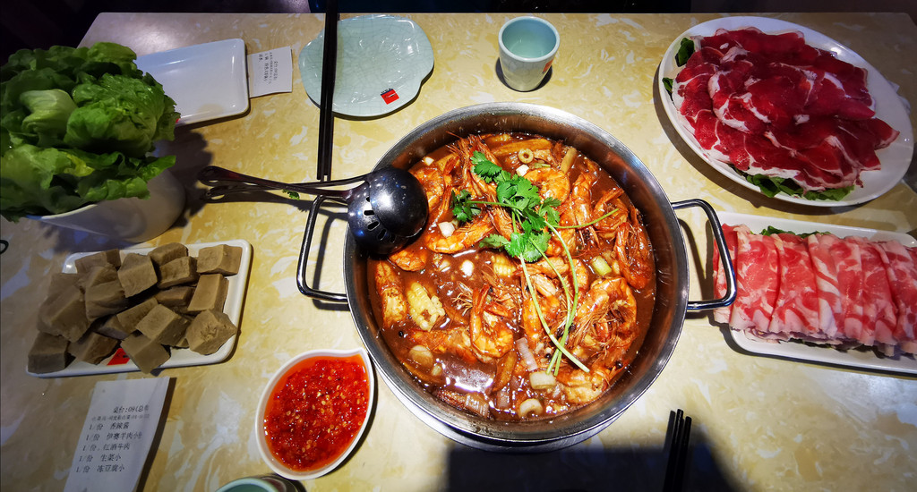 这家号称20年只做虾。吃了一斤大虾、本店特色红酒牛肉、羊肉、老豆腐、生菜。