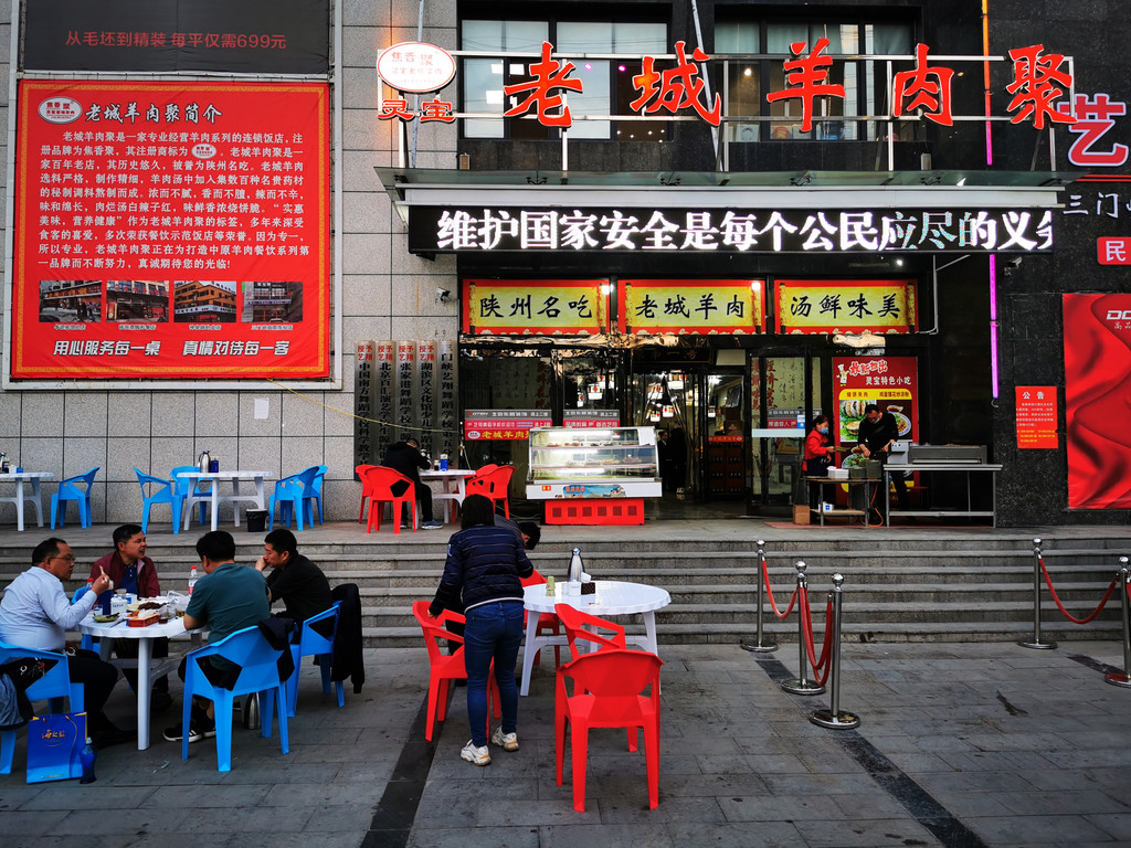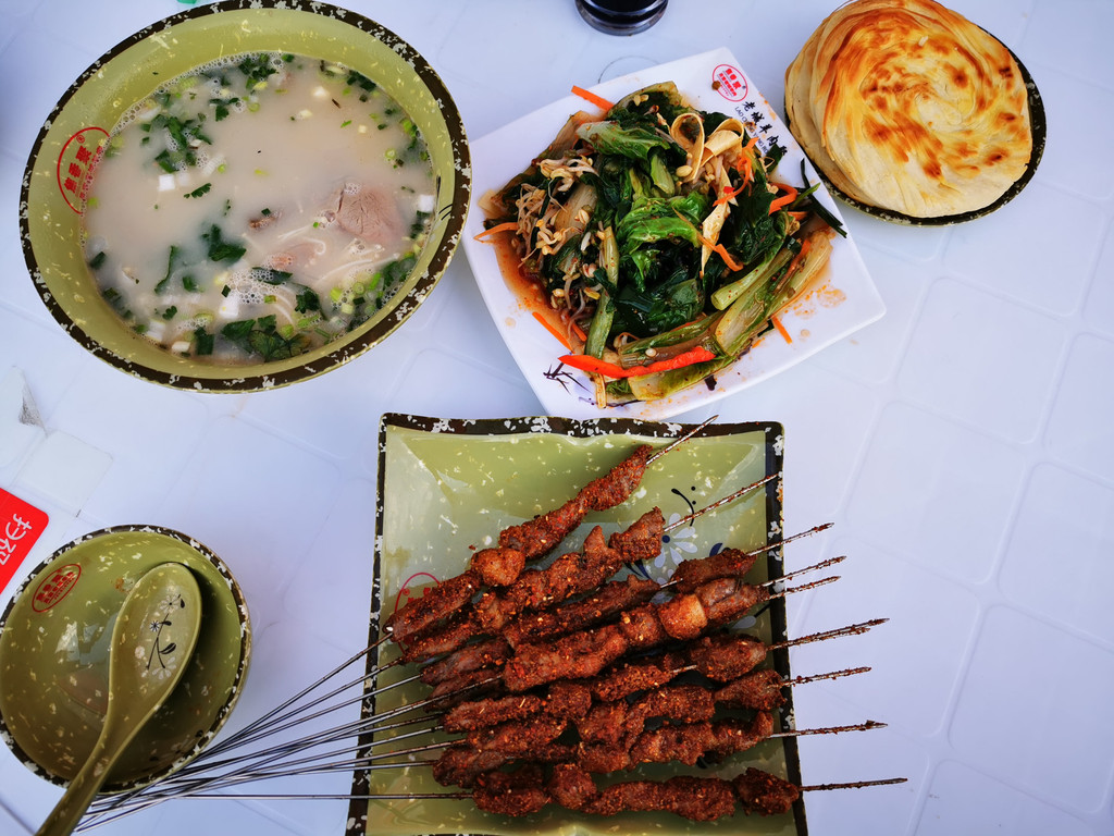 吃羊肉串,喝羊肉汤,啃烧饼。