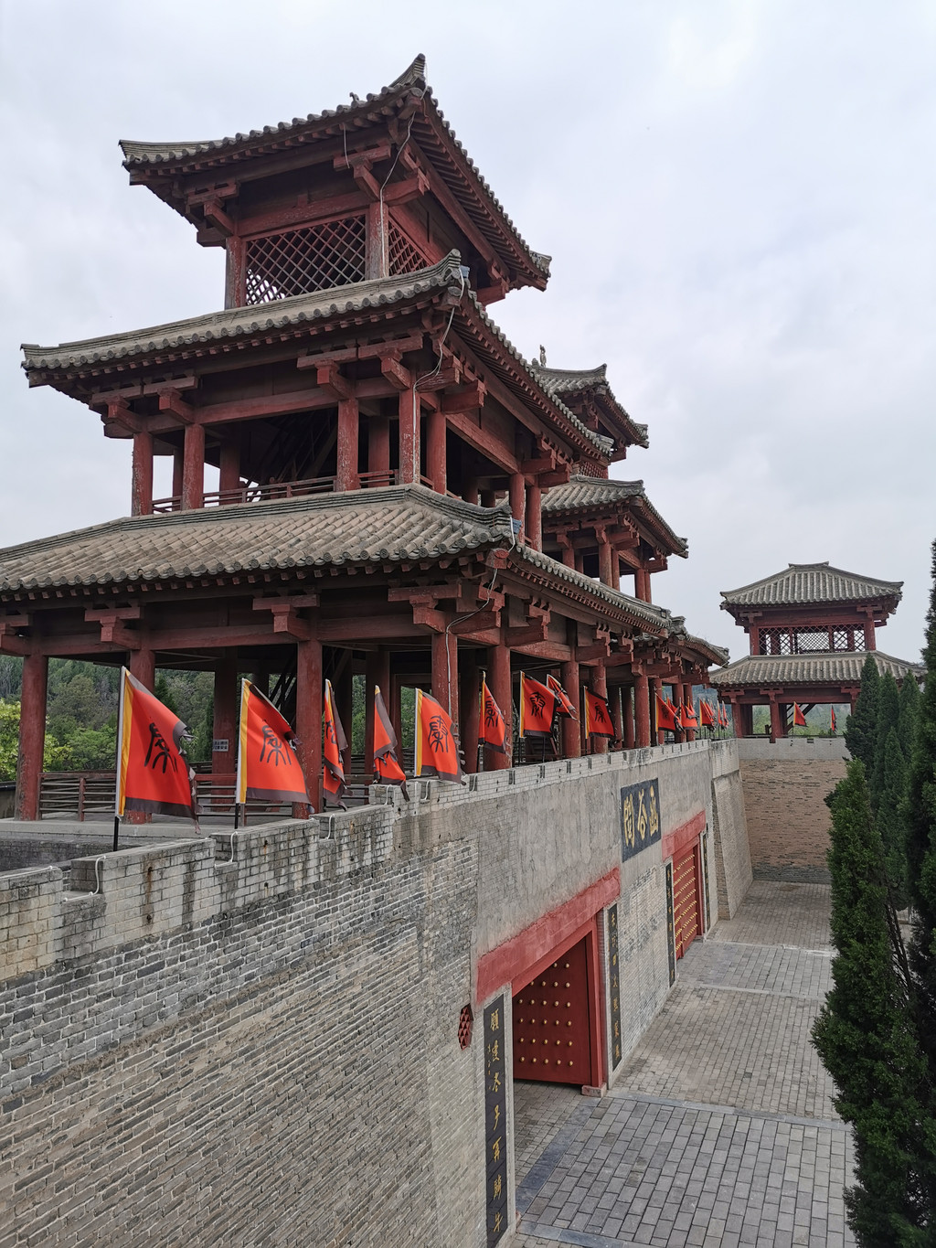 函谷关关楼为秦汉建筑,双门双楼三层悬山顶四阿式,呈一个"鼎"字形,以"一夫当关,万夫莫克"的霸气矗立在函关古道上,再现着函谷关定鼎中原的气势。