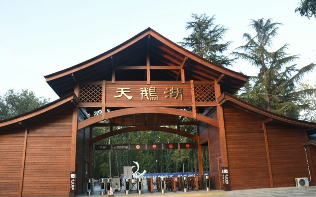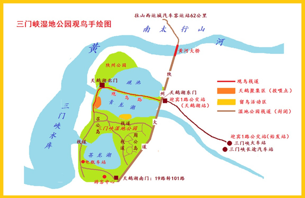 我们将行李箱寄存在三门峡火车站(当晚,我们将从这里乘班列返程),并在站前广场午餐后,随即从站前广场乘迎宾1路公交专线,行程约35分钟,在天鹅湖公交站下车,就来到了著名的三门峡天鹅湖湿地公园东门。