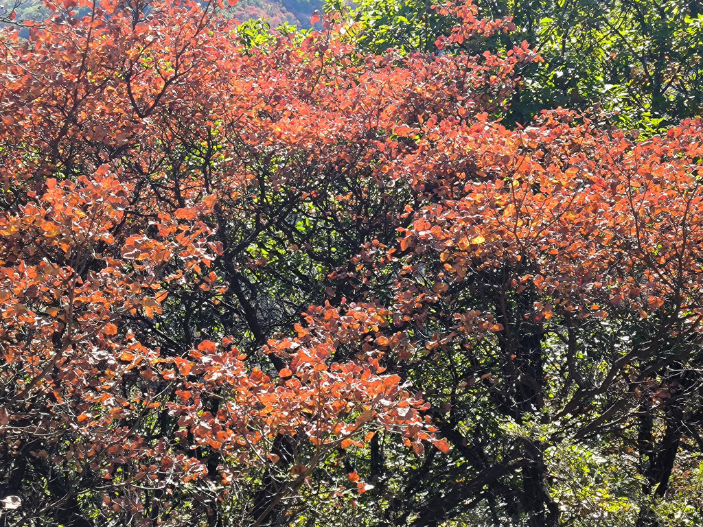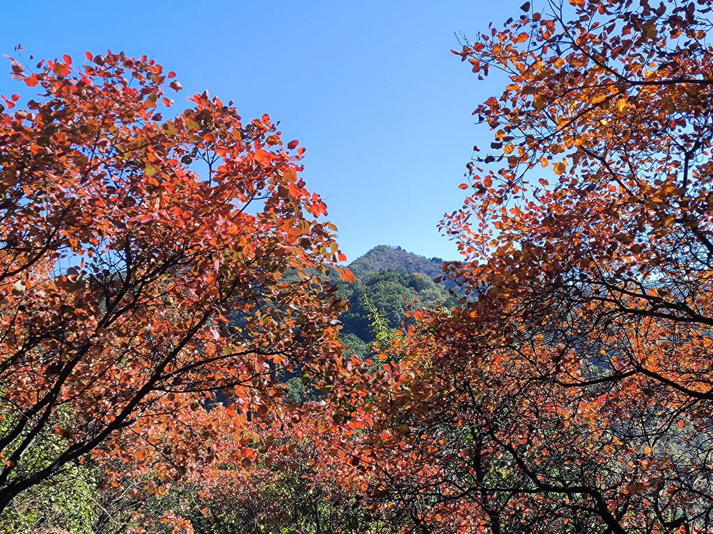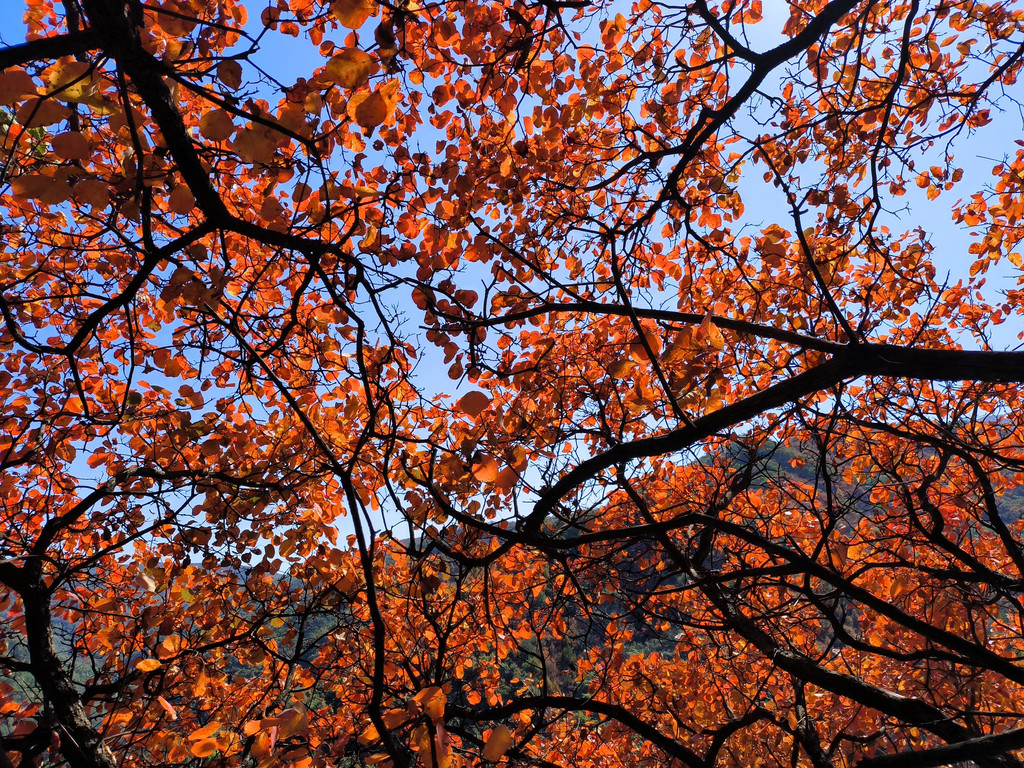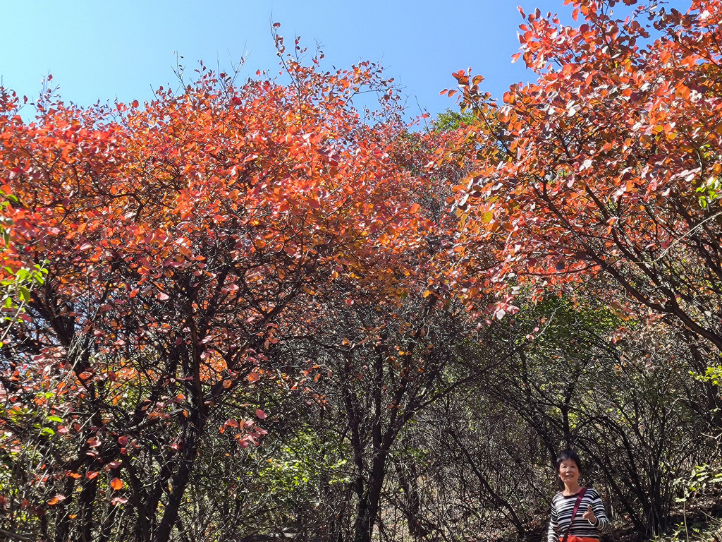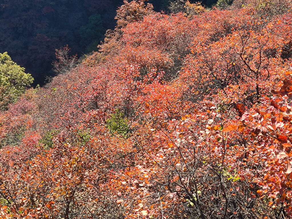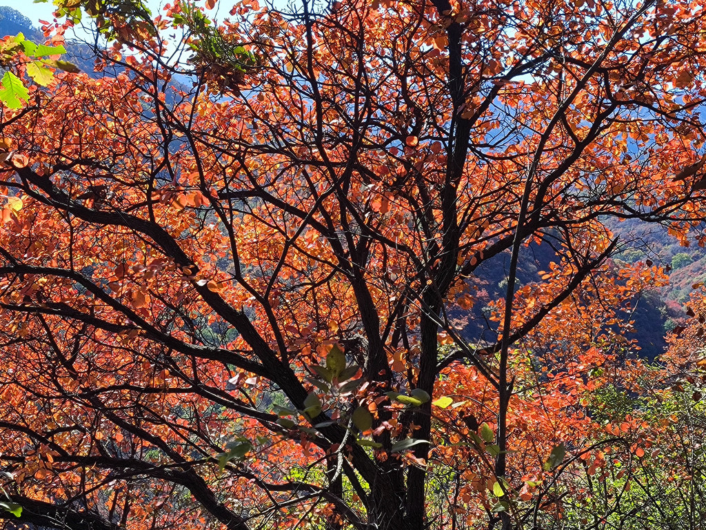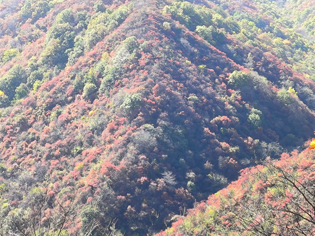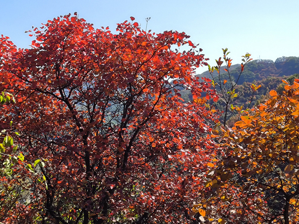 上午9点半我们开始登山,步道前面一部分为木栈道,后面都是狭小的水泥阶梯,而且很多路段已毁,途中可见红叶深浅不一,姹紫嫣红,竞相争艳,这里的红叶并非枫叶,主要树种有漆树、黄栌、南天竹、楝树、五角枫等,因品种和温度的差异,深红、浅红、暗红、橙黄、深绿各种颜色交织在一起,此时阳光正好,拍摄角度也正好,在蓝天的衬映下红叶分外娇艳,阳光从红叶缝隙中漏洒下来,层次分明,五彩斑斓(见下图1-9)。此处远眺四周群山,红叶虽不是漫山遍野,但也大块成片,最后我独自一人登上山顶,可是山顶的红叶也都已凋零了,