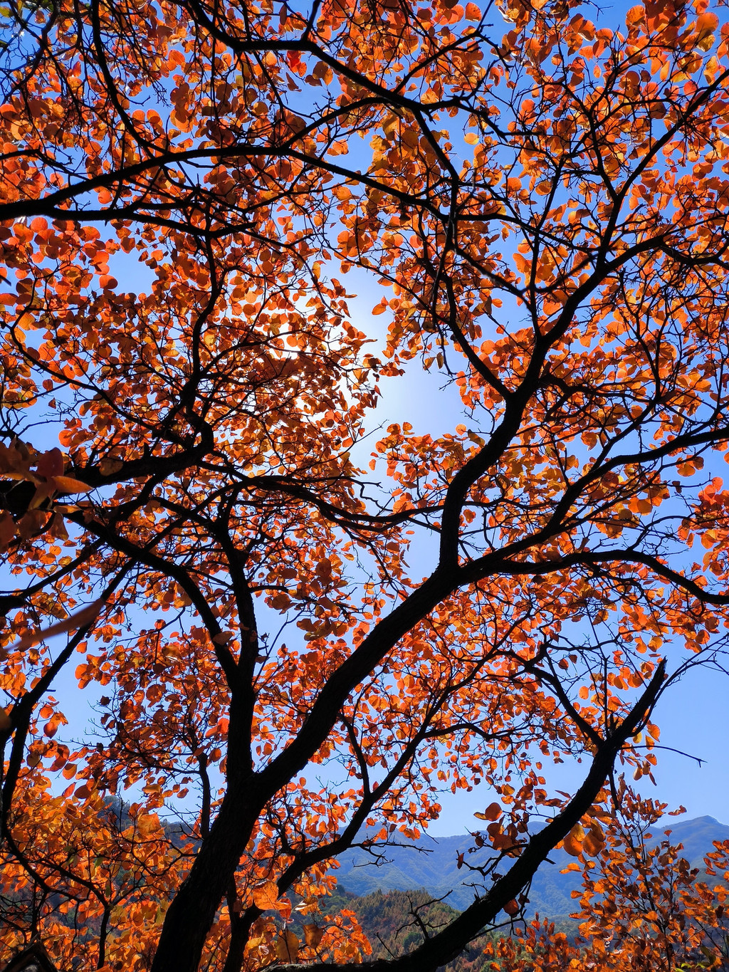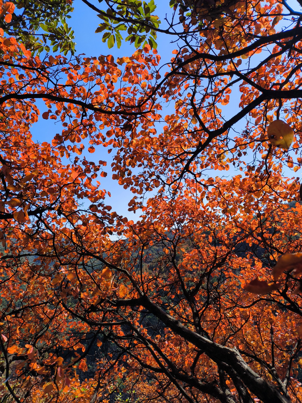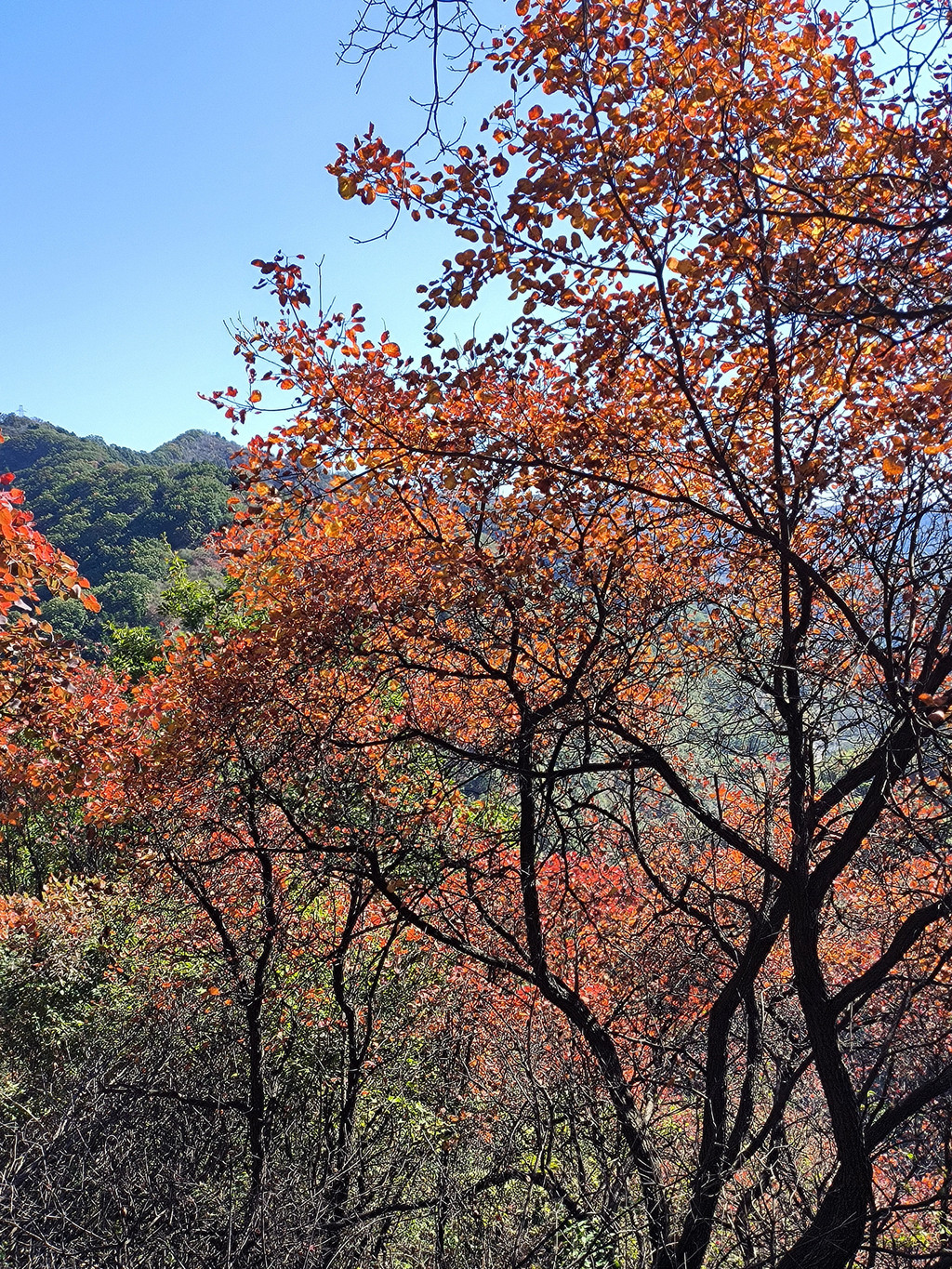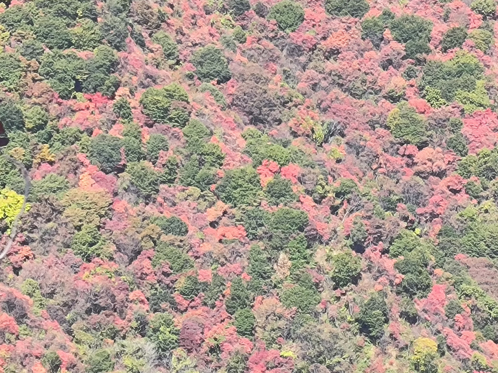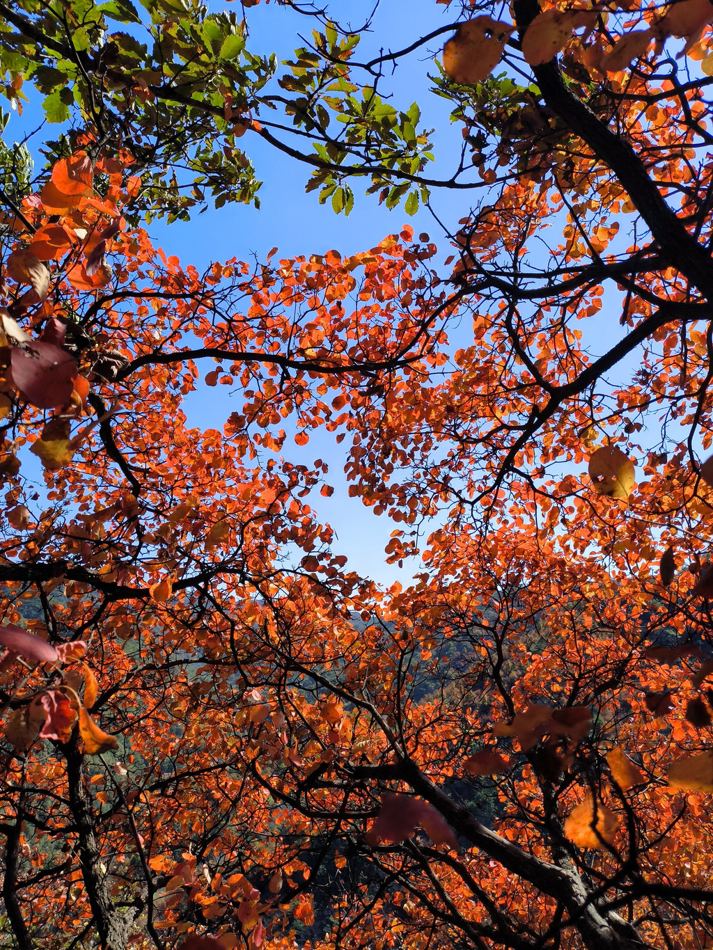 上午9点半我们开始登山,步道前面一部分为木栈道,后面都是狭小的水泥阶梯,而且很多路段已毁,途中可见红叶深浅不一,姹紫嫣红,竞相争艳,这里的红叶并非枫叶,主要树种有漆树、黄栌、南天竹、楝树、五角枫等,因品种和温度的差异,深红、浅红、暗红、橙黄、深绿各种颜色交织在一起,此时阳光正好,拍摄角度也正好,在蓝天的衬映下红叶分外娇艳,阳光从红叶缝隙中漏洒下来,层次分明,五彩斑斓(见下图1-9)。此处远眺四周群山,红叶虽不是漫山遍野,但也大块成片,最后我独自一人登上山顶,可是山顶的红叶也都已凋零了,