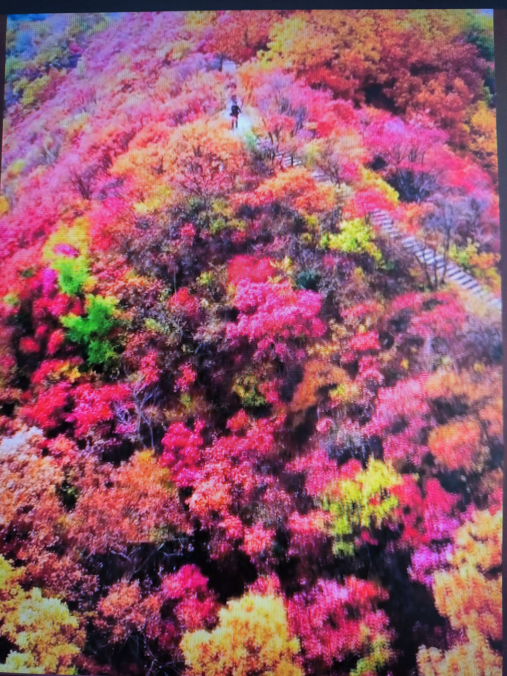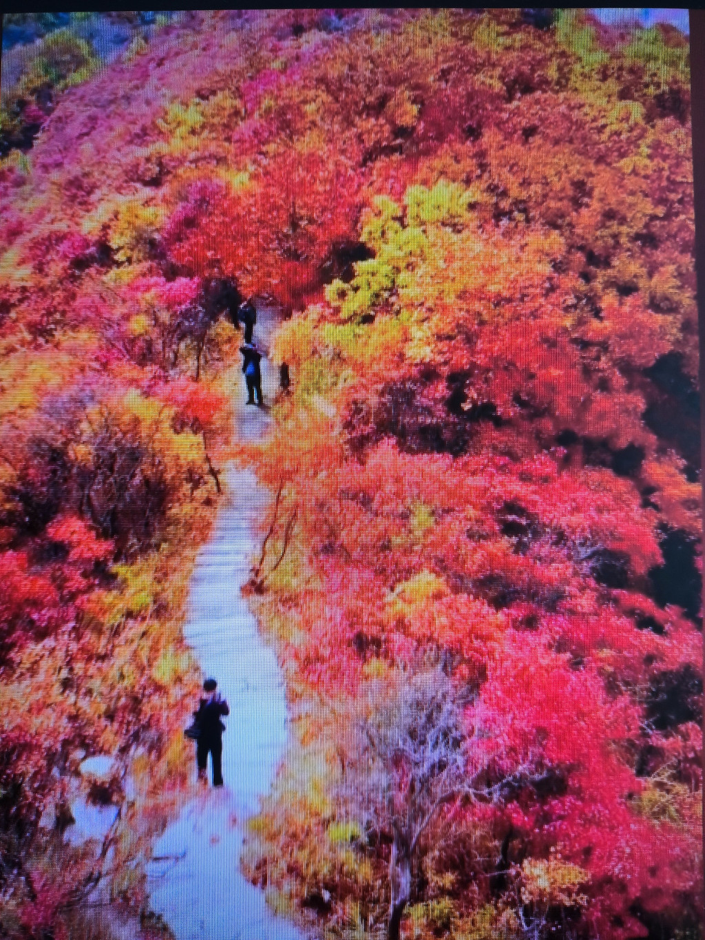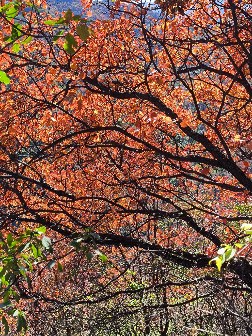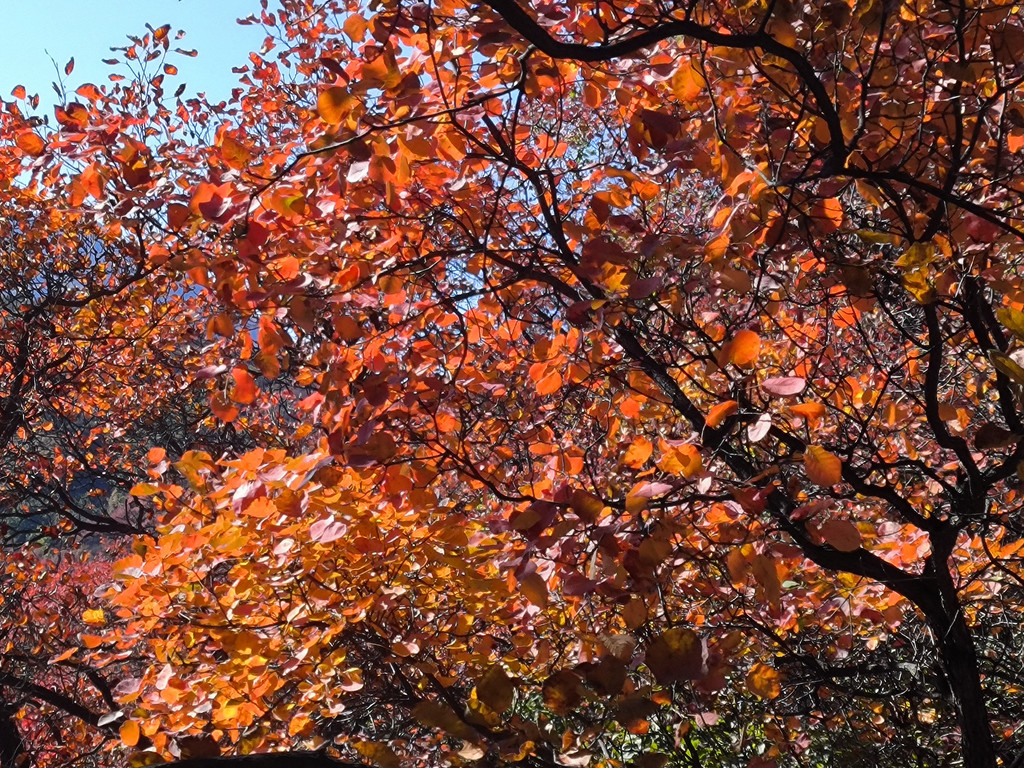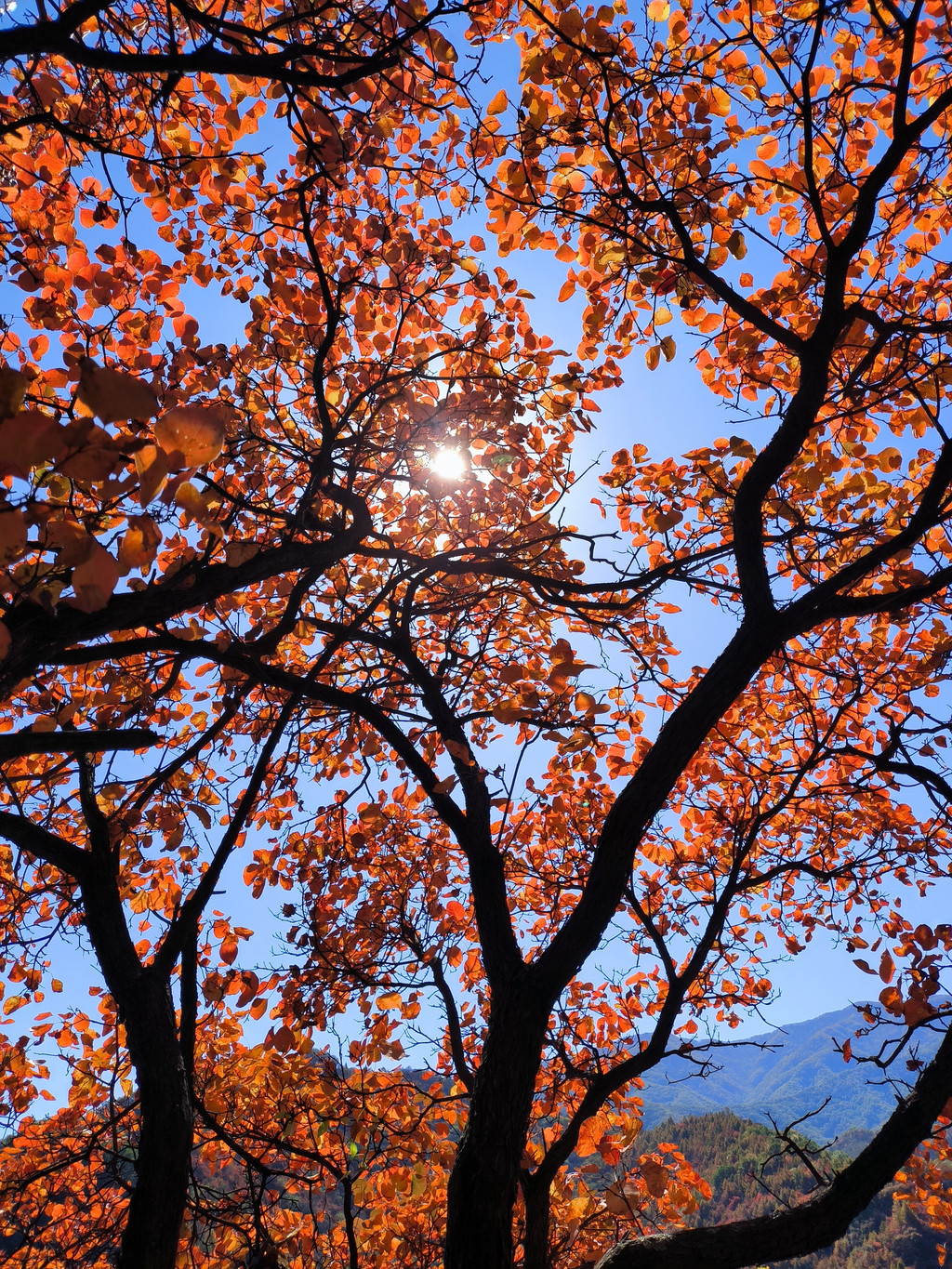 上午9点半我们开始登山,步道前面一部分为木栈道,后面都是狭小的水泥阶梯,而且很多路段已毁,途中可见红叶深浅不一,姹紫嫣红,竞相争艳,这里的红叶并非枫叶,主要树种有漆树、黄栌、南天竹、楝树、五角枫等,因品种和温度的差异,深红、浅红、暗红、橙黄、深绿各种颜色交织在一起,此时阳光正好,拍摄角度也正好,在蓝天的衬映下红叶分外娇艳,阳光从红叶缝隙中漏洒下来,层次分明,五彩斑斓(见下图1-9)。此处远眺四周群山,红叶虽不是漫山遍野,但也大块成片,最后我独自一人登上山顶,可是山顶的红叶也都已凋零了,