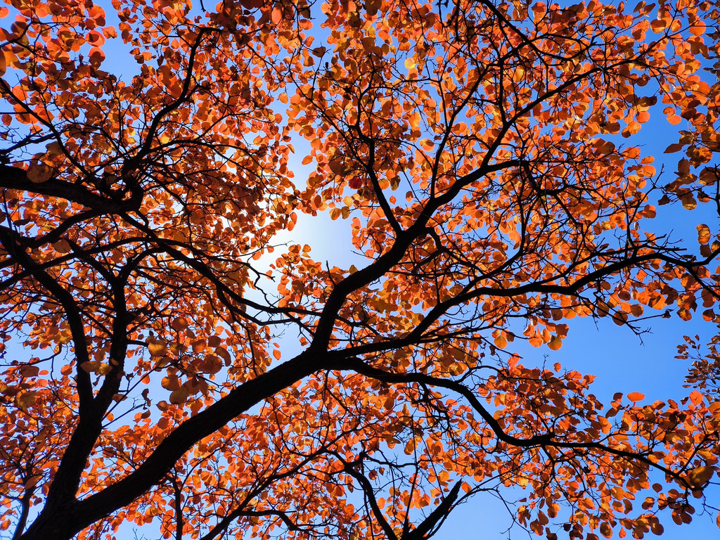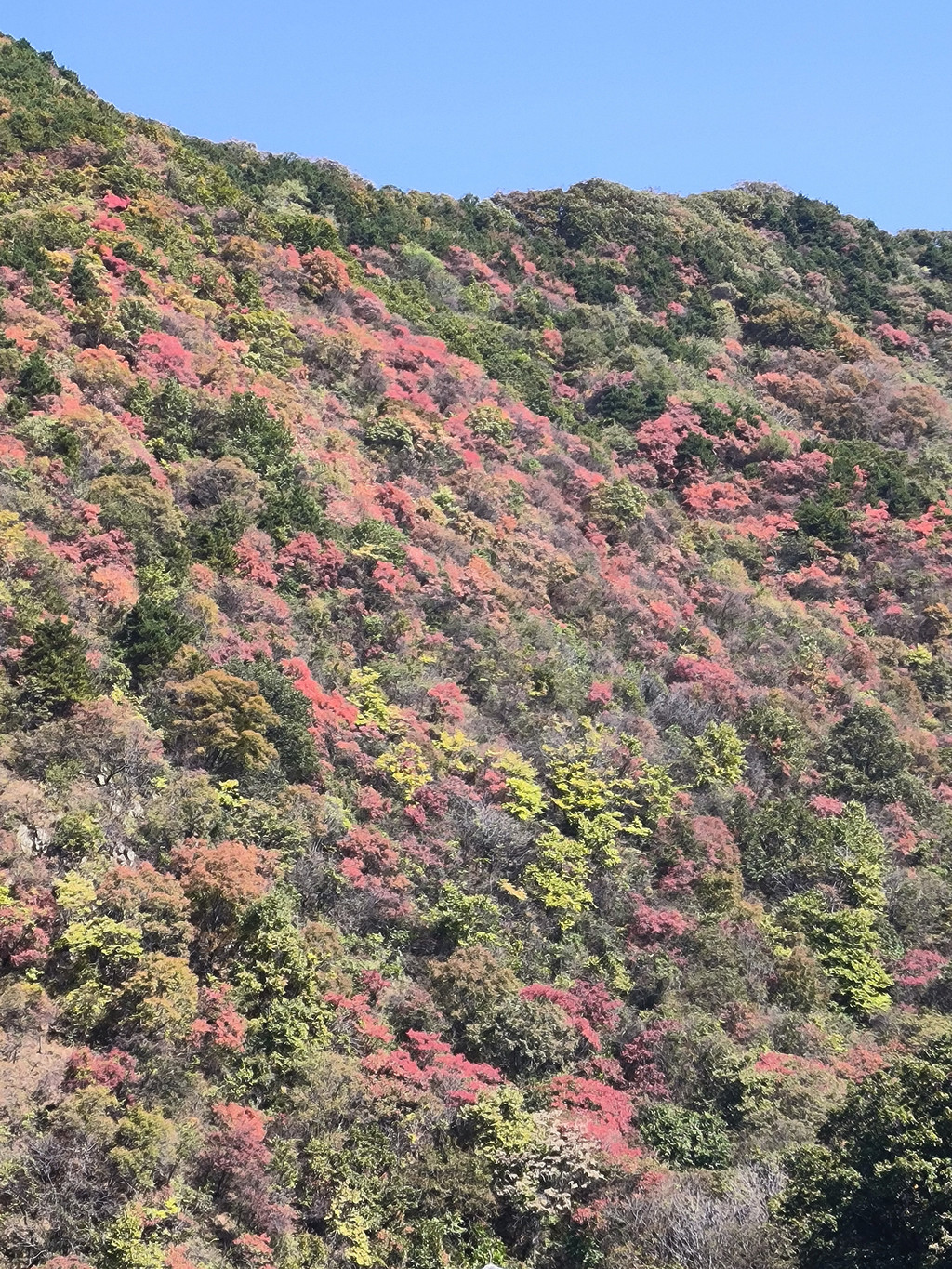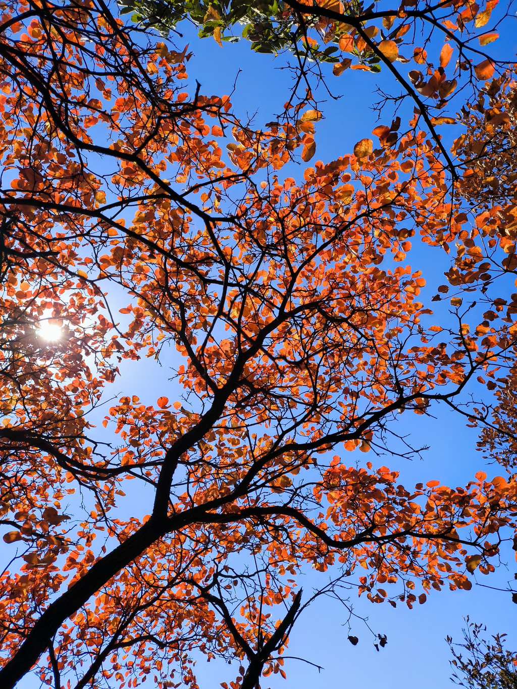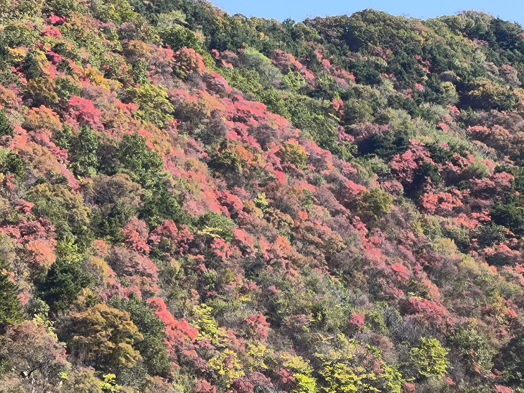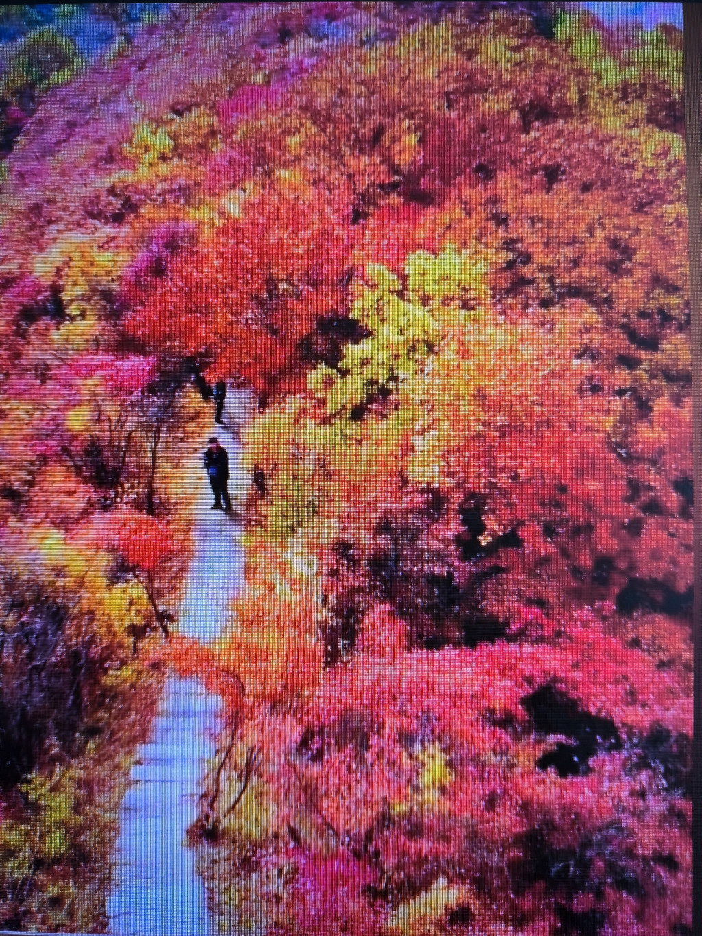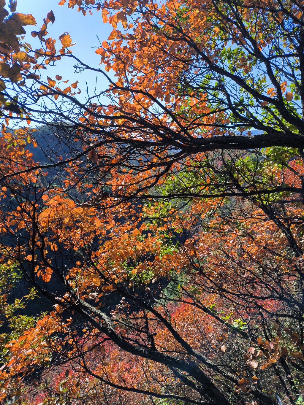 上午9点半我们开始登山,步道前面一部分为木栈道,后面都是狭小的水泥阶梯,而且很多路段已毁,途中可见红叶深浅不一,姹紫嫣红,竞相争艳,这里的红叶并非枫叶,主要树种有漆树、黄栌、南天竹、楝树、五角枫等,因品种和温度的差异,深红、浅红、暗红、橙黄、深绿各种颜色交织在一起,此时阳光正好,拍摄角度也正好,在蓝天的衬映下红叶分外娇艳,阳光从红叶缝隙中漏洒下来,层次分明,五彩斑斓(见下图1-9)。此处远眺四周群山,红叶虽不是漫山遍野,但也大块成片,最后我独自一人登上山顶,可是山顶的红叶也都已凋零了,