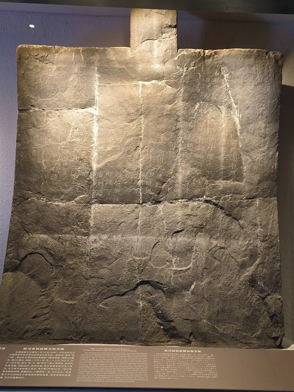 其中汉刻8种,曹魏和北魏石刻各1种,宋刻3种,均被评定为“一级甲等文物”。这里简要介绍几幅:《鄐君开通褒斜道摩崖》镌刻于东汉永平九年(公元66年),鄐君为奉汉明帝诏开凿石门的汉中太守,全文共16行97字,为我国早期摩崖石刻,至今已有1950多年历史,其书体以古拙见长,笔划平直,字形扁平,具有早期隶书特色,为篆书向隶书过渡的典型代表,这种书法风格全国只仅此一种(见下图);
