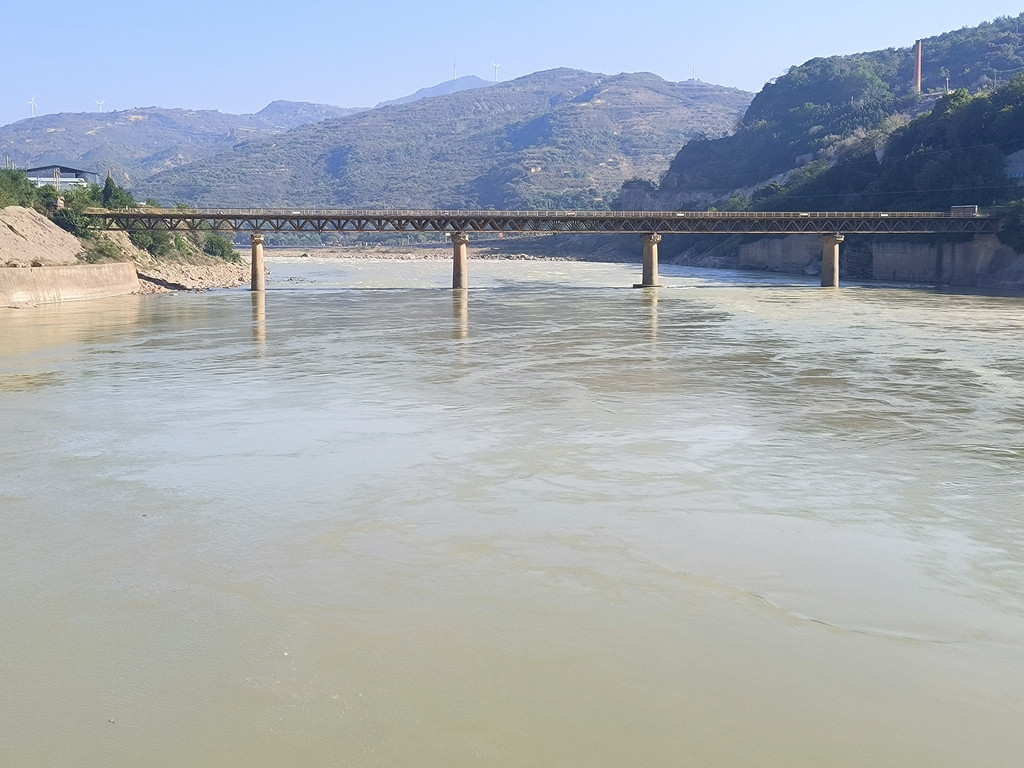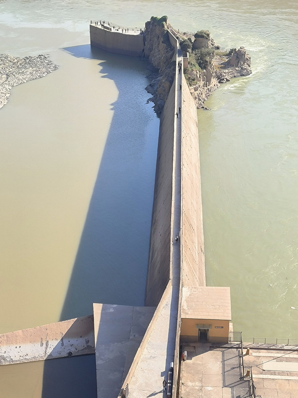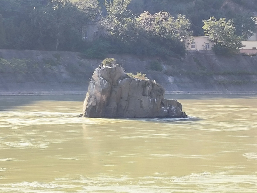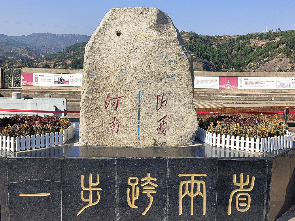 三门峡市位于黄河中游下段,1957年由国务院批准设立,是一座伴随着水利工程兴建而崛起的新兴城市,著名的黄河大坝是其名片之一。从地坑村景区回来后,下午我们便前往黄河大坝,景区距市区14公里,但无公交前往,交通不太方便,打的需要近30元,如不和司机约好可能无车返回。下车左拐很快就来到大坝顶上,对岸山崖上是前国家主席李先念的题字:“万里黄河第一坝”,我们在坝上向前走不远便可见一块竖石,其下方有“一步跨两省”5个字,黄河在这一段是山西、河南的界河,以主河道中轴线为省界,在这里可以体验前脚入晋、后脚在豫的特殊感受,向南俯看坝下可见一条导流堤向前延伸,将黄河一分两半(见下图1-4)。