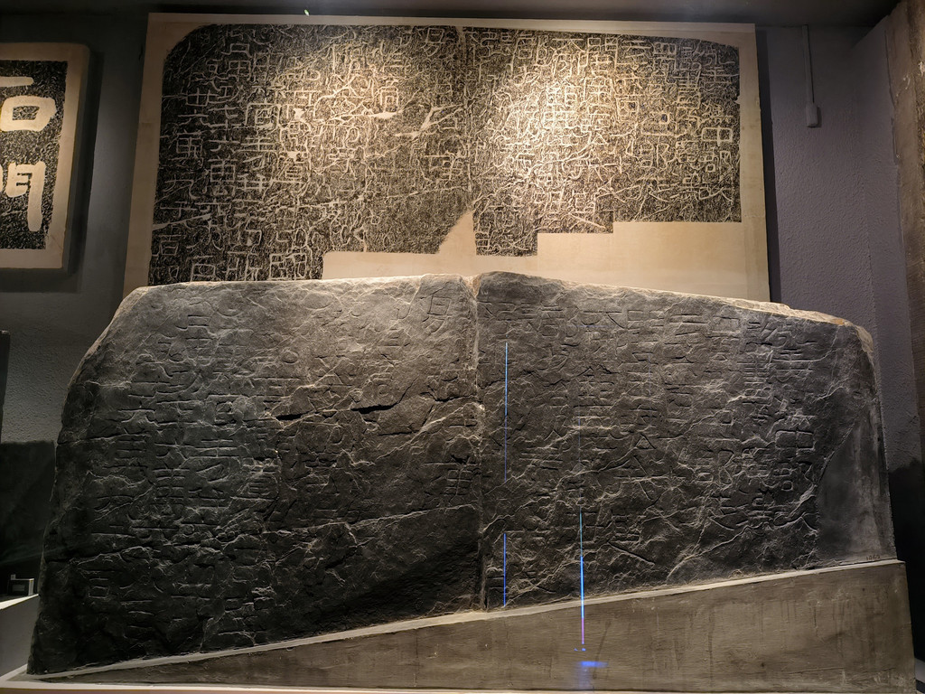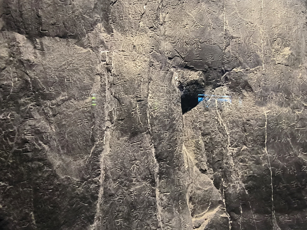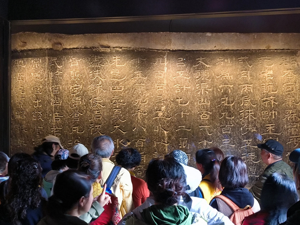 《山河堰落成记》是石门摩崖石刻中最大的一块碑刻,横4.6米,纵1.8米,约9平方米,尺幅之大极为罕见,记述了南宋绍熙五年(公元1194年)水患后当地官府和百姓集资修山河堰的过程,是近千年前的一份治水工程报告,为“南宋隶书第一人”晏袤所书,波势纵横,大气磅礴,是宋隶的代表作,在“石门十三品”中最为引人注目,此碑刻占据了馆内整整一面南墙,面前站满了到此观摩学习的当地老年大学学员们(见下图)。