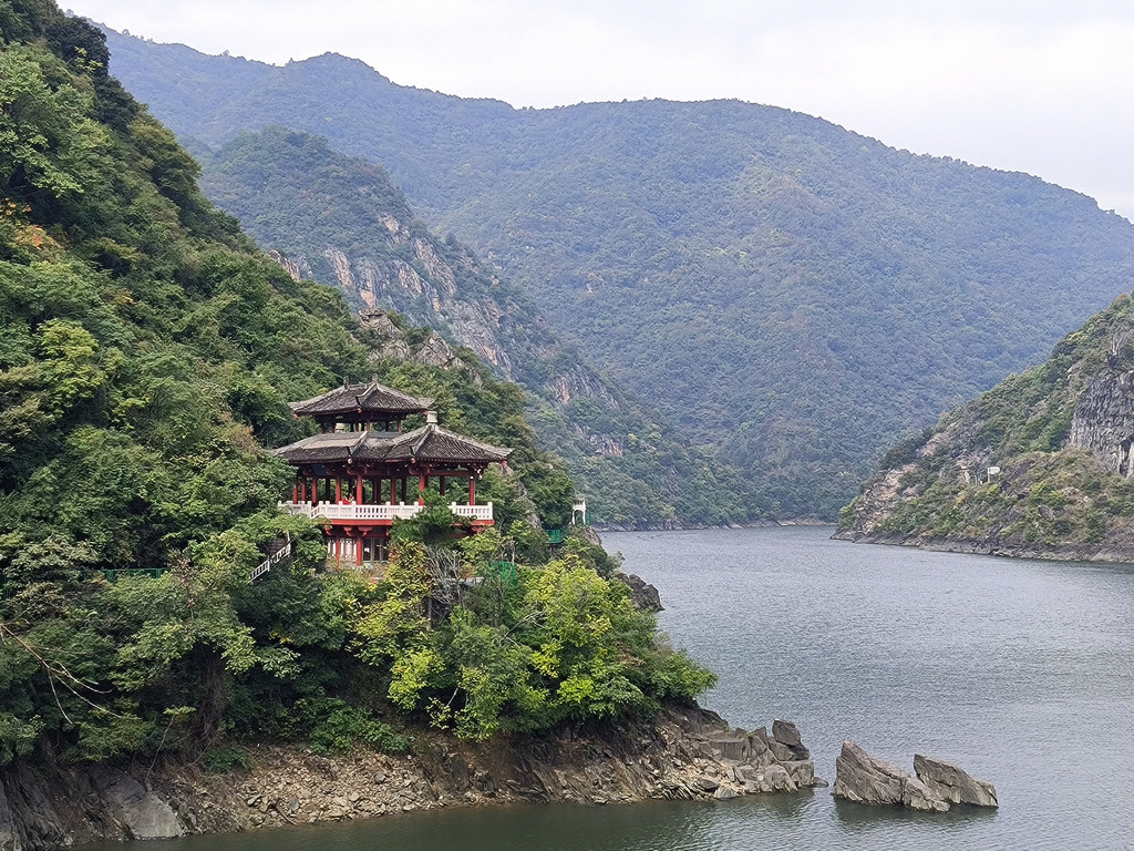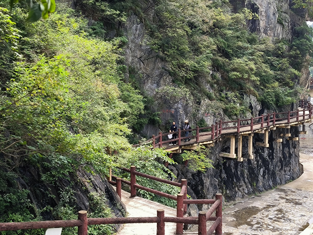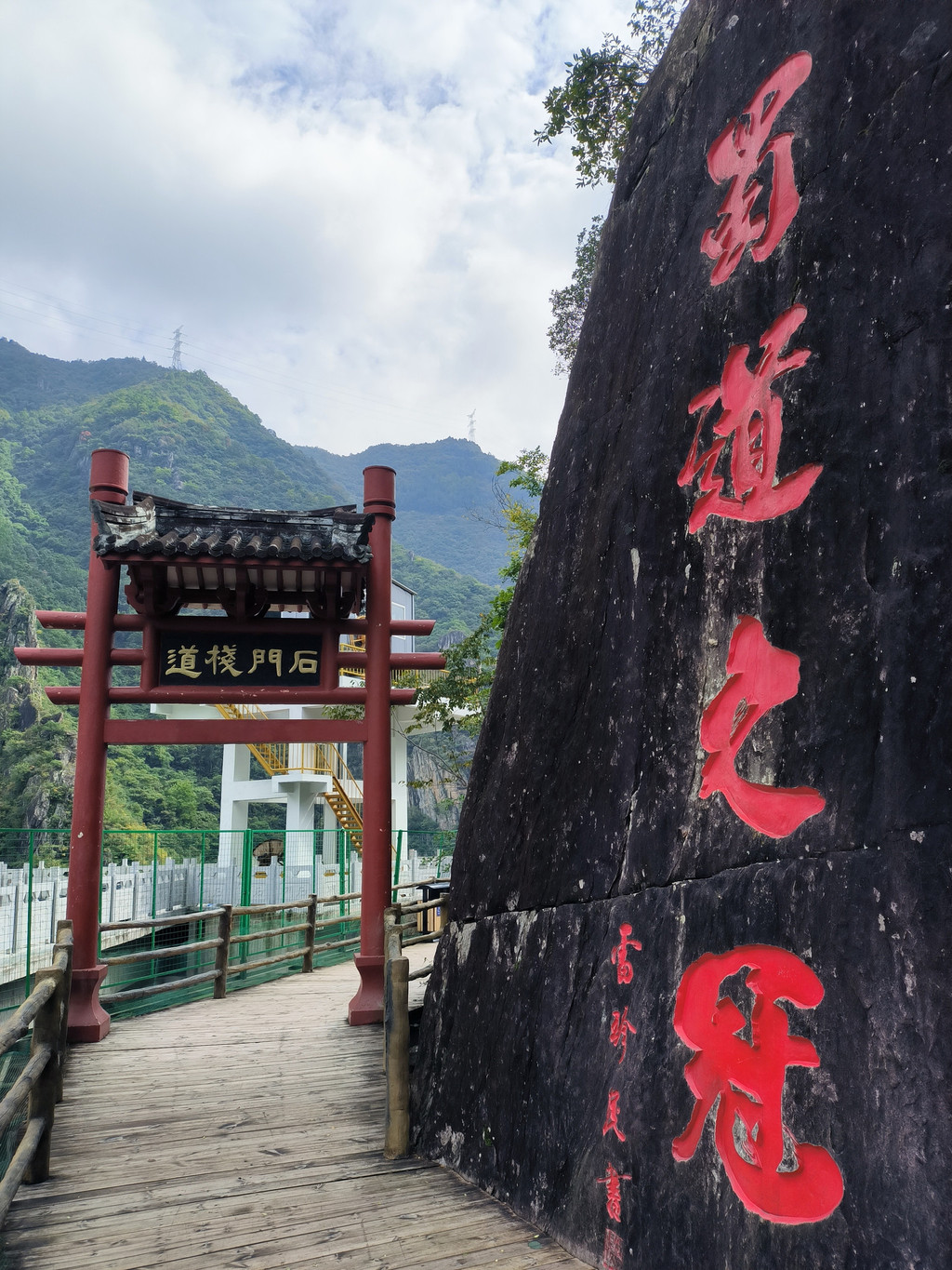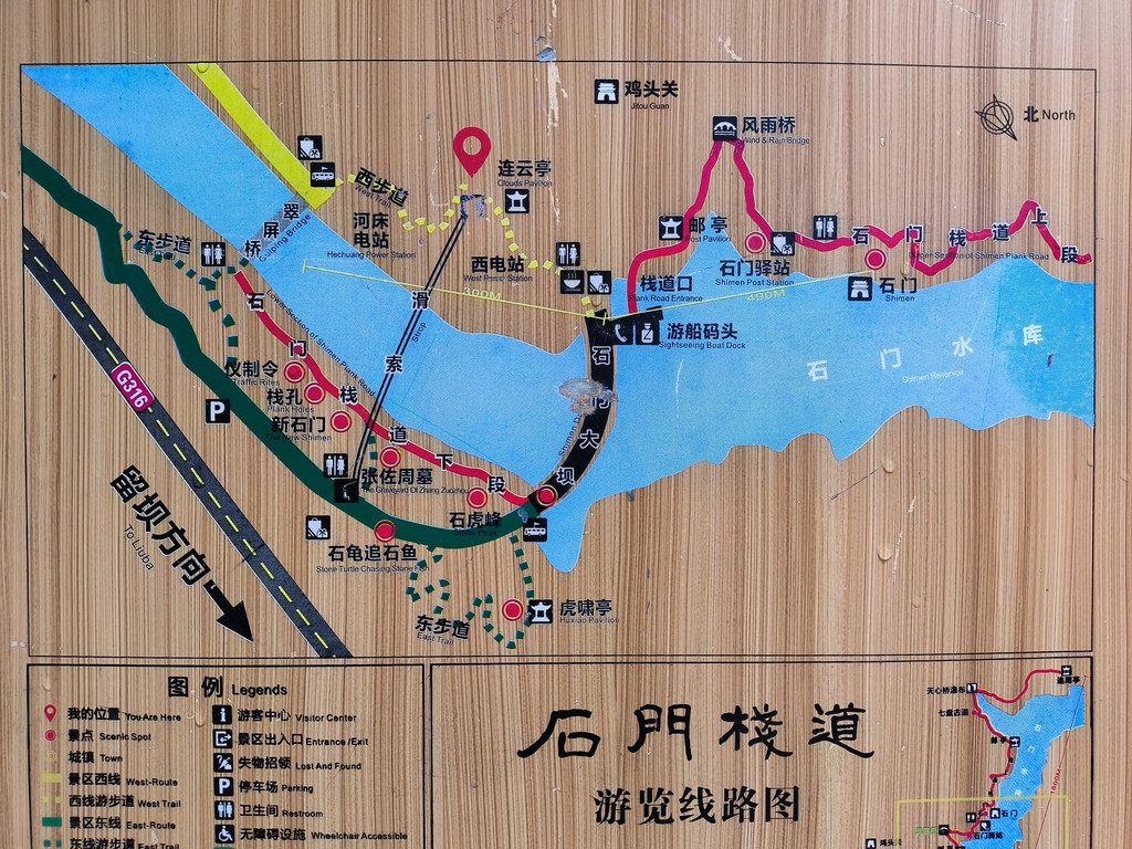 我们返回翠屏桥,再从西岸步道上山(见下图1),来到石门栈道上段,途中还有驿站,实际上此道已不在原址,而是在原址上方抬高70米修建而成,长1.8公里,原址早已被水库淹没,这里还仿造了一座石门(见下图5),而真正的古石门仍在水库淤沙下的10多米深处。