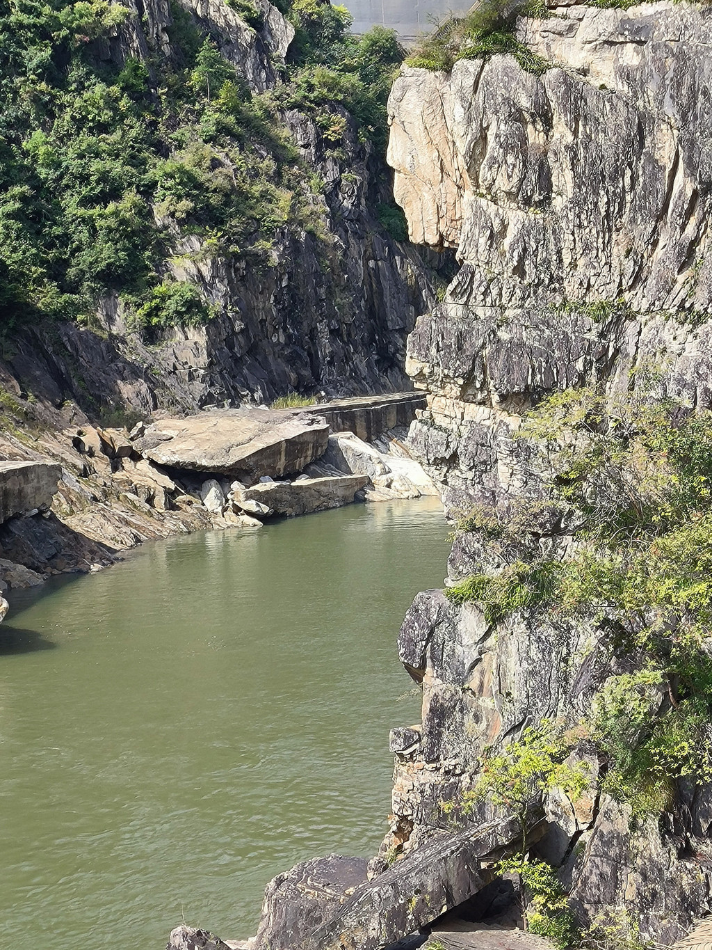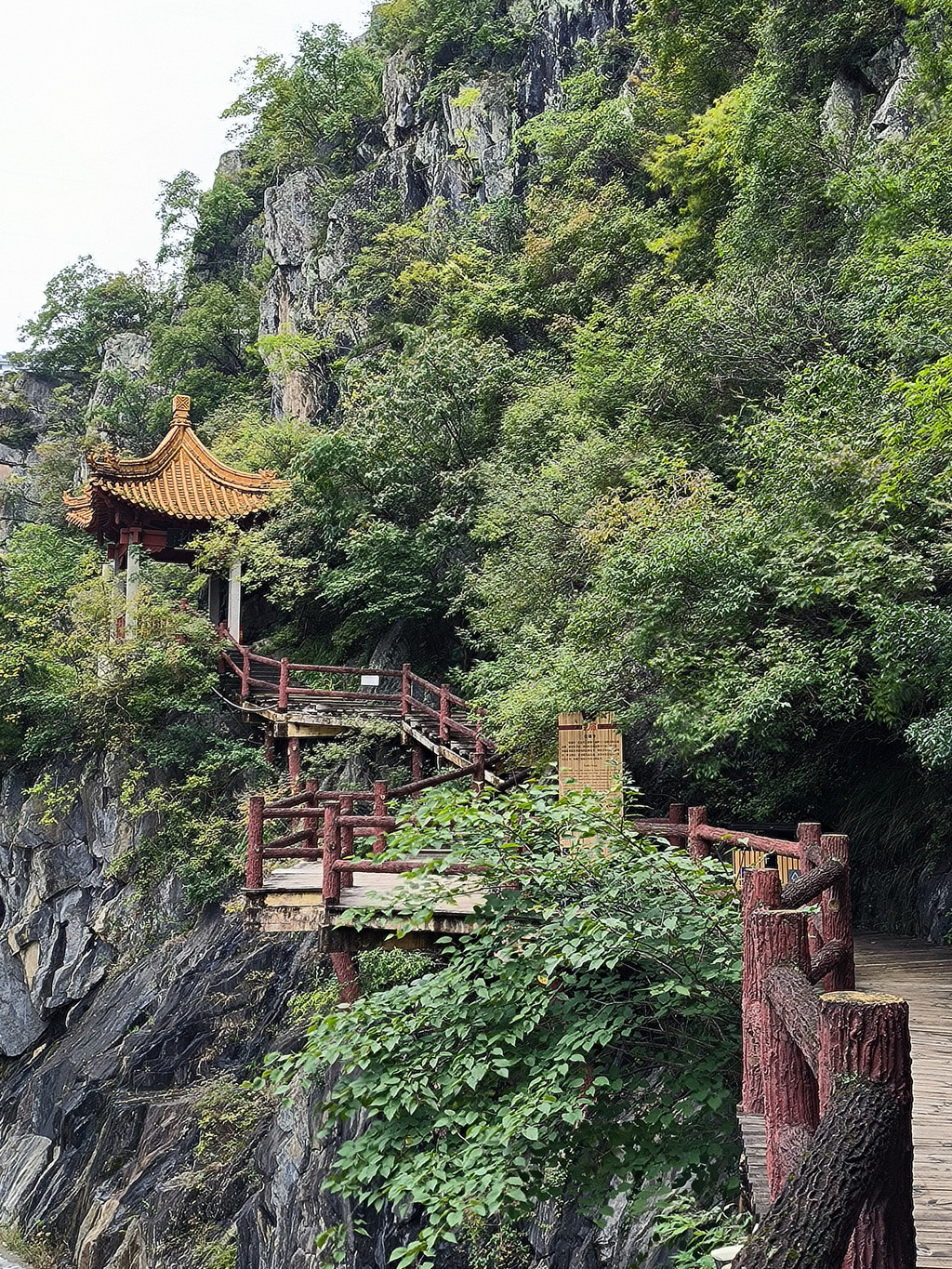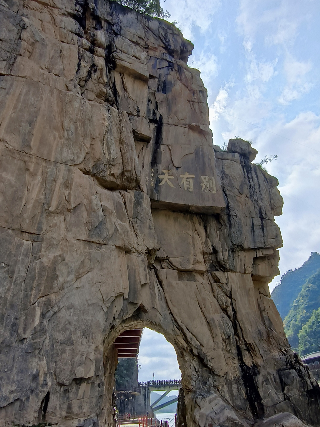 我们返回翠屏桥,再从西岸步道上山(见下图1),来到石门栈道上段,途中还有驿站,实际上此道已不在原址,而是在原址上方抬高70米修建而成,长1.8公里,原址早已被水库淹没,这里还仿造了一座石门(见下图5),而真正的古石门仍在水库淤沙下的10多米深处。