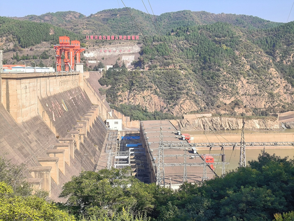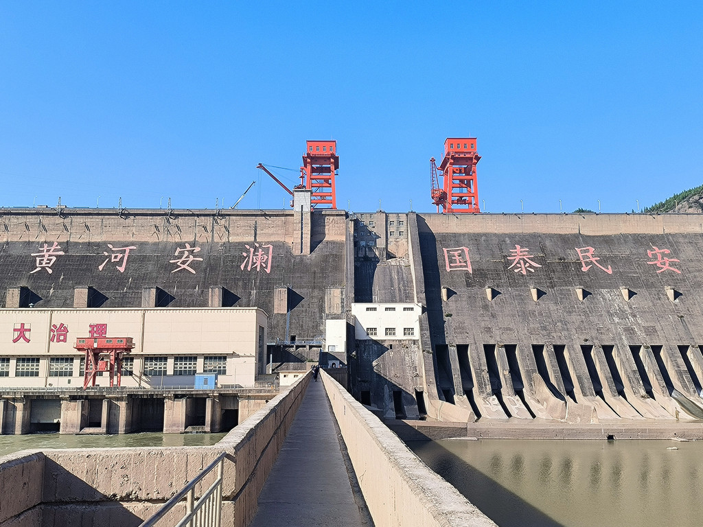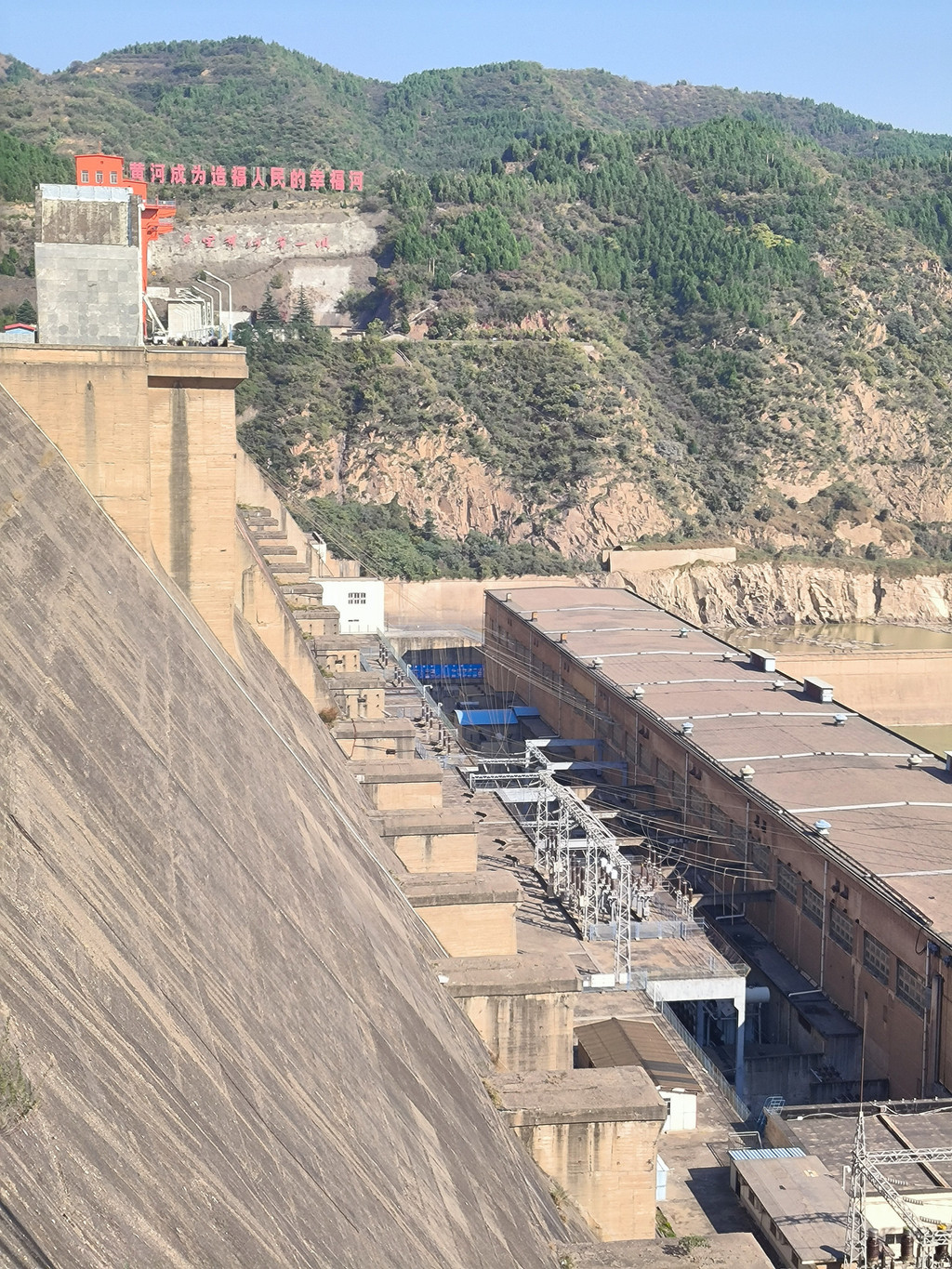 我们坐电梯下至坝底,再沿导流堤走到尽头,前方一桥飞架,回身仰望长713米、高106米的大坝雄姿,坝身上是“黄河安澜,国泰民安”8个大字,而西侧的砥柱似乎显得微不足道(见下图1-4)。三门峡大坝是新中国在黄河干流兴建的第一座大型水利枢纽工程,故被誉为“万里黄河第一坝”,在上世纪50年代的新中国,三门峡可以说无人不知,无人不晓,我至今仍清晰记得著名诗人贺敬之的《三门峡歌 》,其中气势磅礴的头几句是:“望三门,三门开,黄河之水天上来”!神门险,鬼门窄,人门以上百丈崖。黄水劈门千声雷,狂风万里走东海……”。这里是来过中央领导最多的水利工程,刘少奇、董必武、邓小平、李先念、彭真、陈云、陈毅、李富春、聂荣臻、彭德怀、邓颖超、罗荣桓、陶铸、习仲勋、万里、李鹏等都曾来此视察。