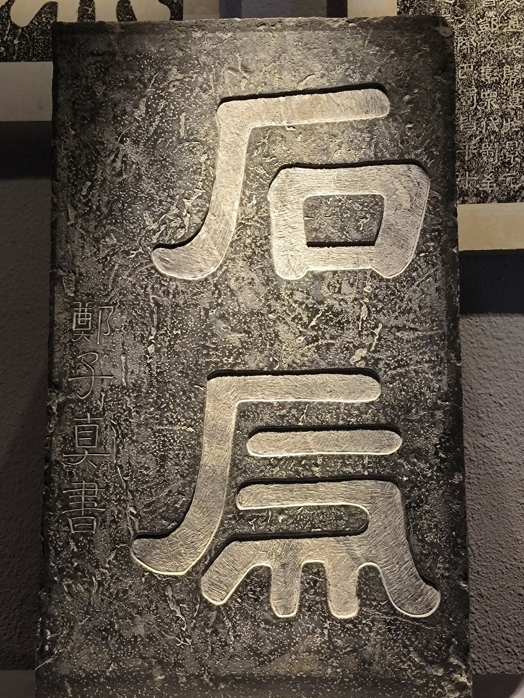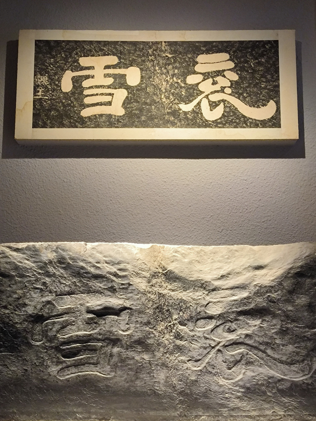 《石门铭》为北魏宣武帝永平二年(公元509年)所刻,楷书26行,其书法由隶向楷过渡,字体开张大气,舒展有度,自然豪放,在魏碑中具有极其重要的地位,于右任评论称:“下笔简纯,自然优雅”(见下图1);《衮雪》落款为“魏王”,是曹操仅有的存世手迹(见下图2),建安二十四年(公元219年)曹操游览褒斜道,见褒河汹涌翻腾,便提笔写下“衮雪”二字,随从提醒“衮”字少了三点水,曹操大笑:“一河流水,岂缺水乎!”,“衮雪”旁原有“魏王”二字,曾见于宋人著录,现已漫漶;
