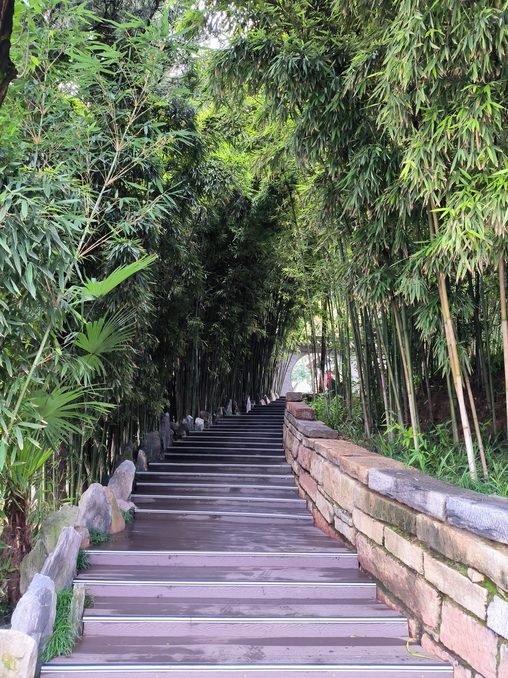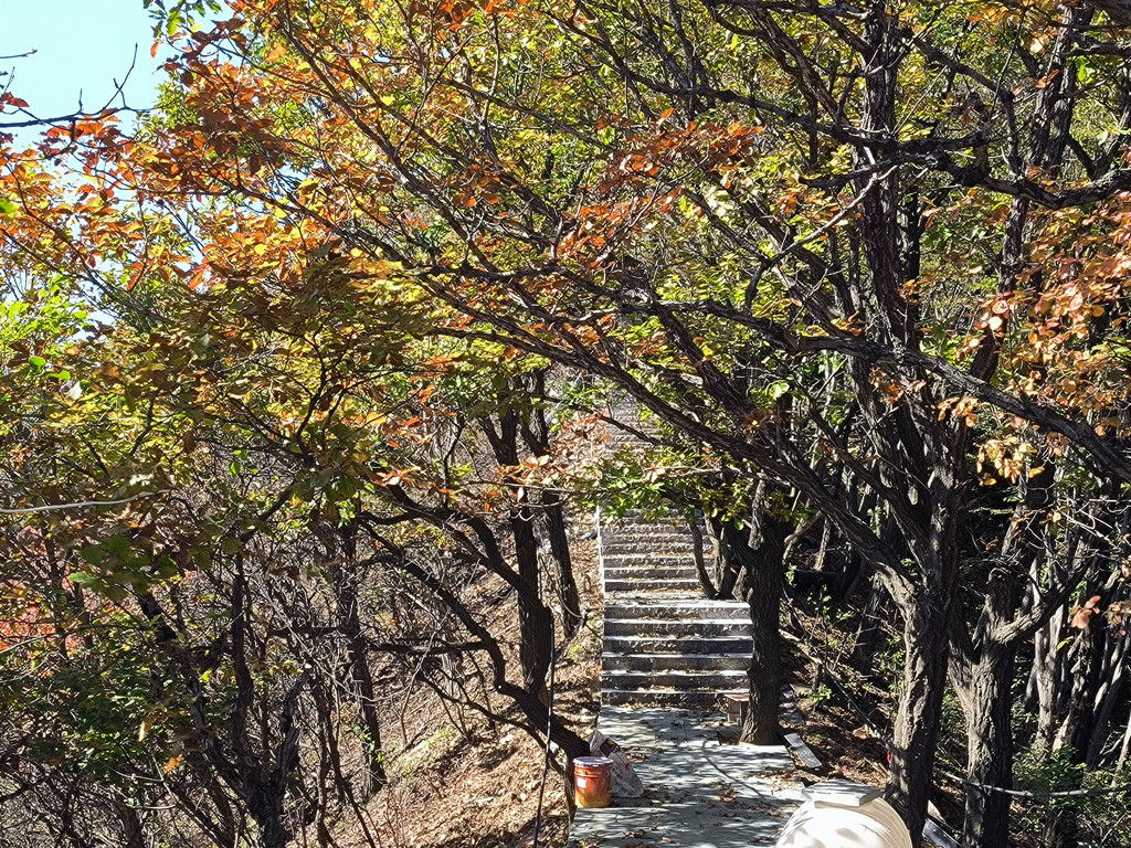 这里正在进行基础施工,原来的黄色方形小亭已被拆除,现在正在新一座建更高、更大的楼阁,道路也已更换成更宽、更平的石板,但施工现场空无一人,可见甘山景区正在进行大规模的基础建设,难怪途中上山的路挖断不少,因此,景区不收门票、城里过来的班车停开也不足为奇了。看来甘山景区在基础建设方面还有很多工作要做,除了今天我们攀登的这座山外,棠荫广场周围的其他几座山均无路可上,红叶美景只可远观,不能近看,因此都要修路上去,才能将半日游延长至一、二日游,让游客留下来住一宿。