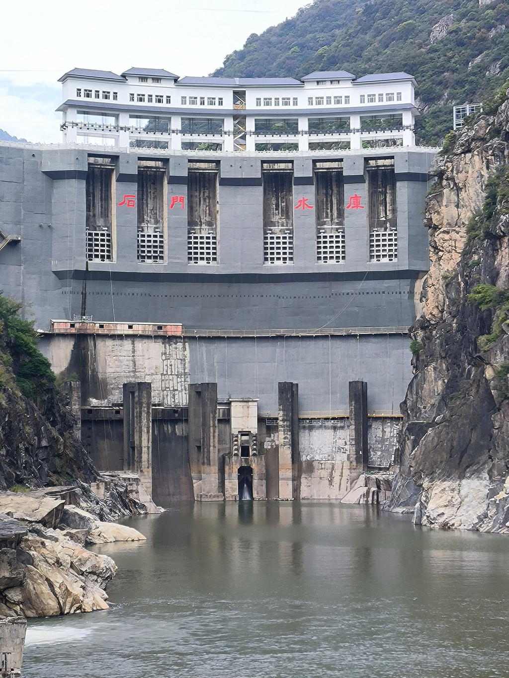 下方河边是近代开凿的新石门(见下图1),为1937年修建川陕公路时所开凿,新石门隧道有3段,总长62米,宽近5米,附近岩壁上还产生了众多近代题刻(见下图2),有的位于高崖之上,有的也已没入水库之中。此段山崖也险峻异常(见下图3-5)。前方的石门水库建成于1979年,大坝高达88米,曾是当时国内最高的混凝土双曲拱坝(见下图6),也是汉中最大的水利枢纽工程,但现在这里也面临三门峡水库同样的问题,该水库淤积量已达全部库容的1/3。