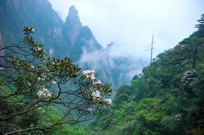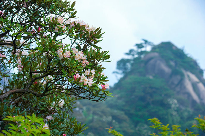 三清山的杜鹃花不同于一般公园红色的映山红,主要以白色的杜鹃花为主,兼有红色杜鹃点缀。据悉,三清山的杜鹃树种类共有十余种,包括猴头杜鹃、云锦杜鹃、鹿角杜鹃、变色杜鹃等,其中猴头杜鹃是中国特有品种,长于海拔500-1800米的山坡林中,三清山独特的地貌为猴头杜鹃的生长提供了肥沃的土壤,遍布三清山的猴头杜鹃也让五六月份的三清山更加多姿多彩。由于高海拔的缘故,三清山经常笼罩在云海中,云雾缥缈的三清山,再加上杜鹃花的点缀,更加美丽动容。正所谓云端听花开,云深不知处。