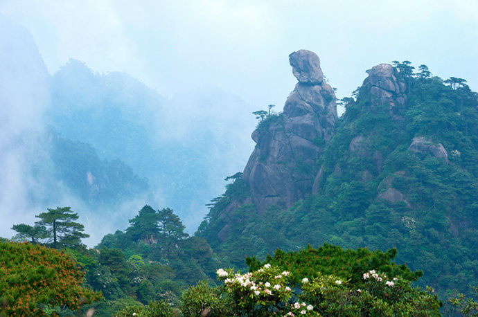 三清山有着许多造型奇特,形神兼备的奇石,巨蟒出山、司春女神、猴王献宝、玉女开怀、老道拜月等等,都是三清山标志性的奇景。本图为海拔1180余米,通高86米的“司春女神”,整座山体造型看上去就像一位秀发披肩的少女,真是鬼斧神工。亿万年来,女神端坐山峰,默然注视芸芸众生,神态祥和。传说女神为西王母第二十三女,名瑶姬。百姓认为她是春天的化身,因而称之为“司春女神”。