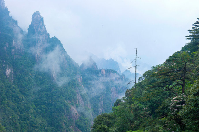 雾中“巨蟒出山”,此峰紧傍峭壁,从深谷中突兀勃起,直冲云天,高128米,峰端形如蛇首,峰腰略有粗细,似蛇身挺立,酷似巨蟒朝天猛窜,气势逼人,可谓稀世奇景,令人叹为观止,唏嘘不已。
