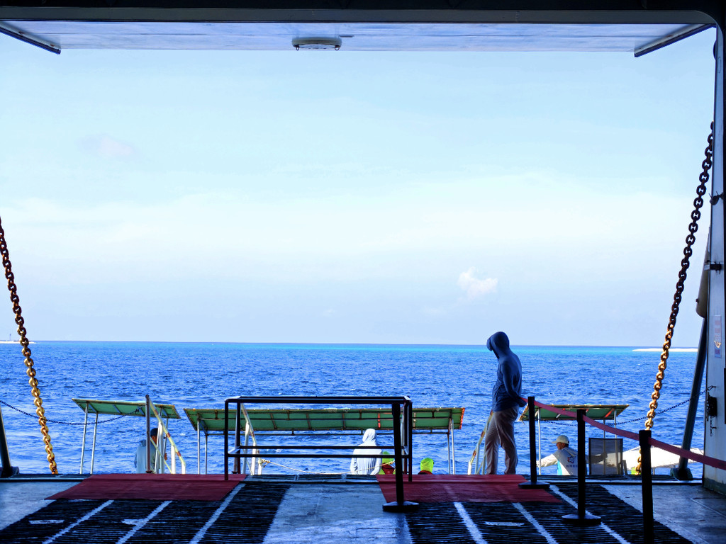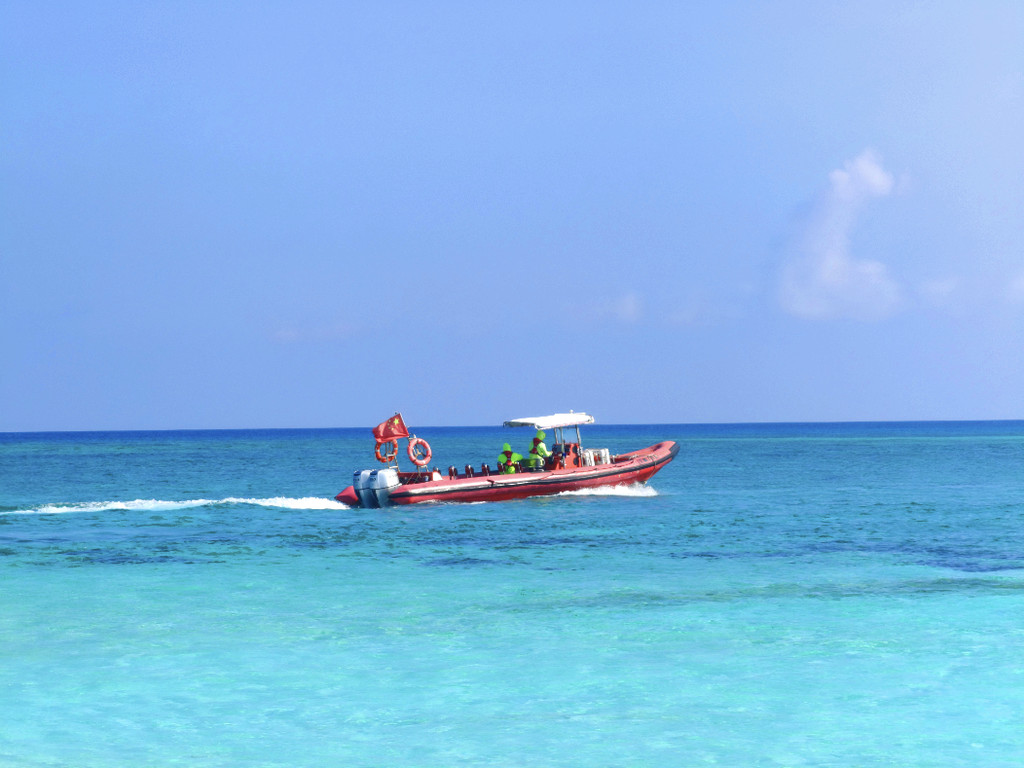 邮轮是下午5点出发,第二天8日一早就到了西沙群岛,当天吃过早餐,上午乘快艇去全富岛。全富岛,别名全富峙,位于中国西沙群岛永乐群岛的永乐环礁东北缘,全富岛是一座无人岛,东西长约200米,南北宽近百米,面积仅有0.02平方千米,海拔大约1米,一切都是原始质朴的模样。