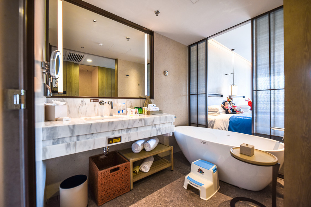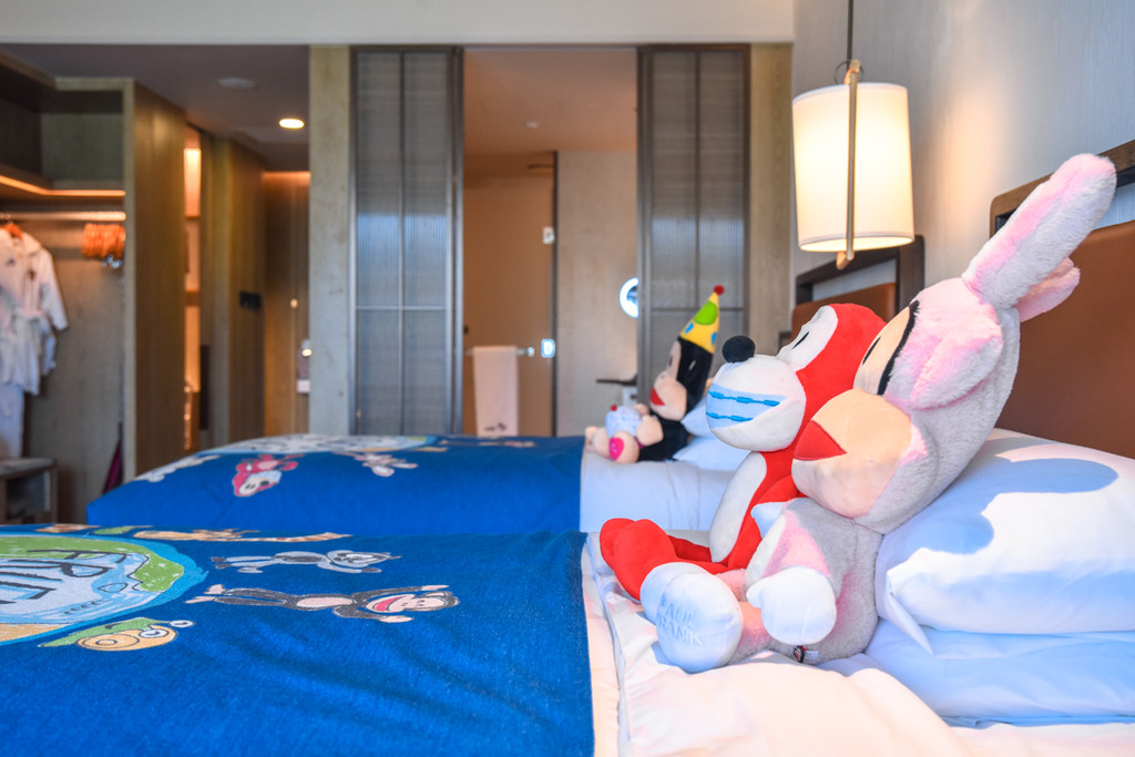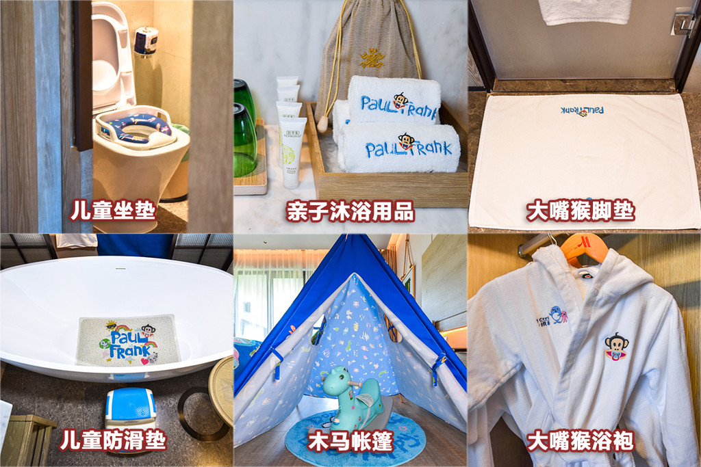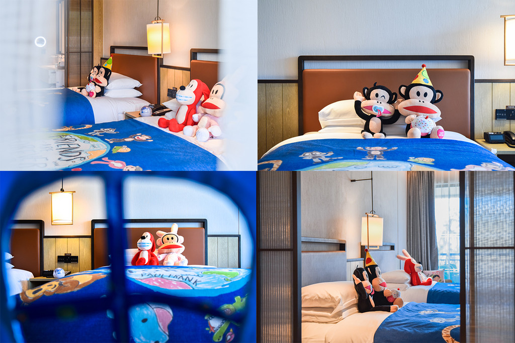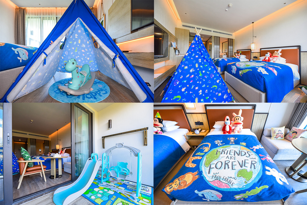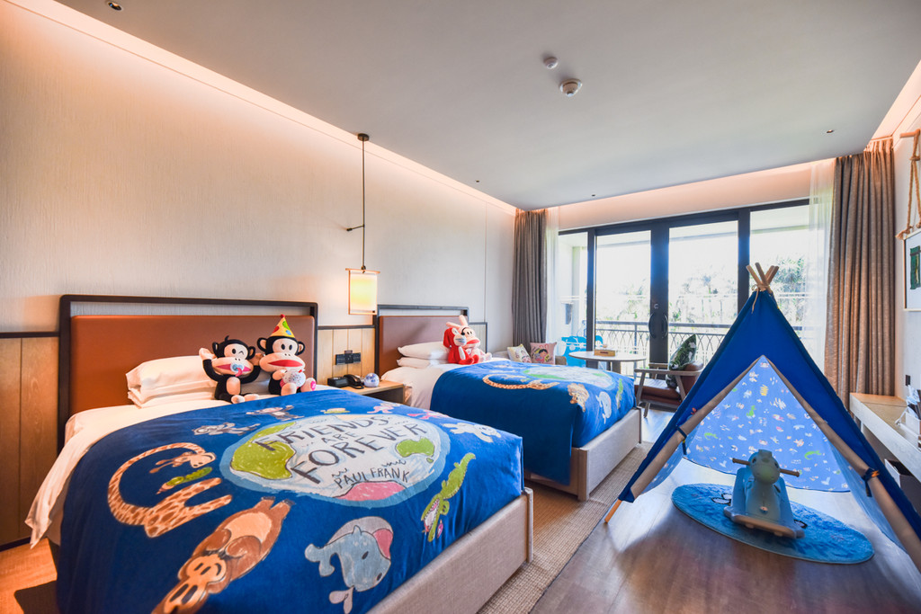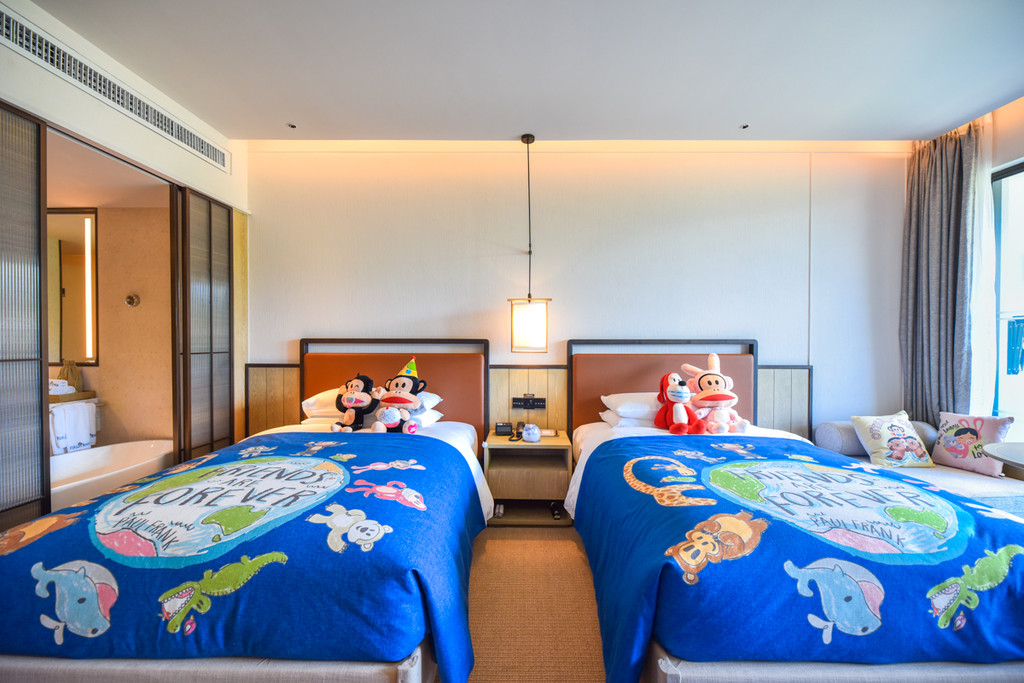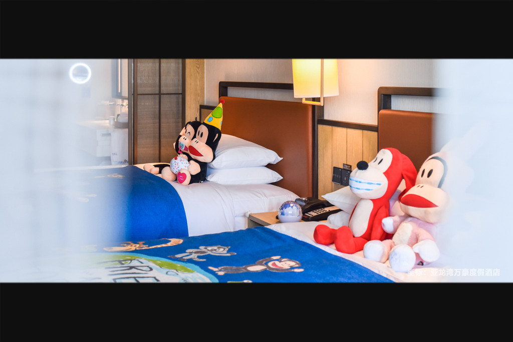 从白天到夜晚,新翼客房,给我的体验,也在变幻着。夜间,灯光更柔和,暖色系氛围,让度假变得更温馨。听说这次酒店全新升级的房型,还有大嘴猴亲子房,童心未泯的我自然是要参观一番。