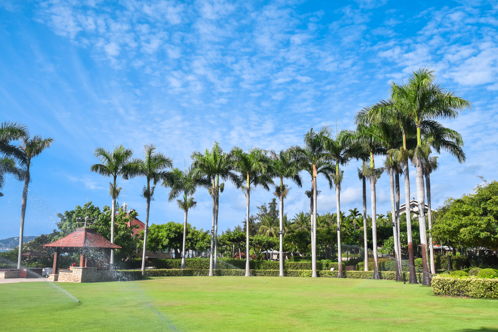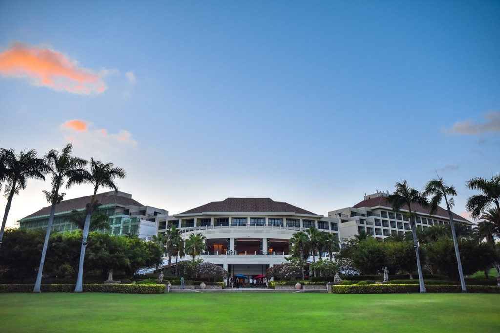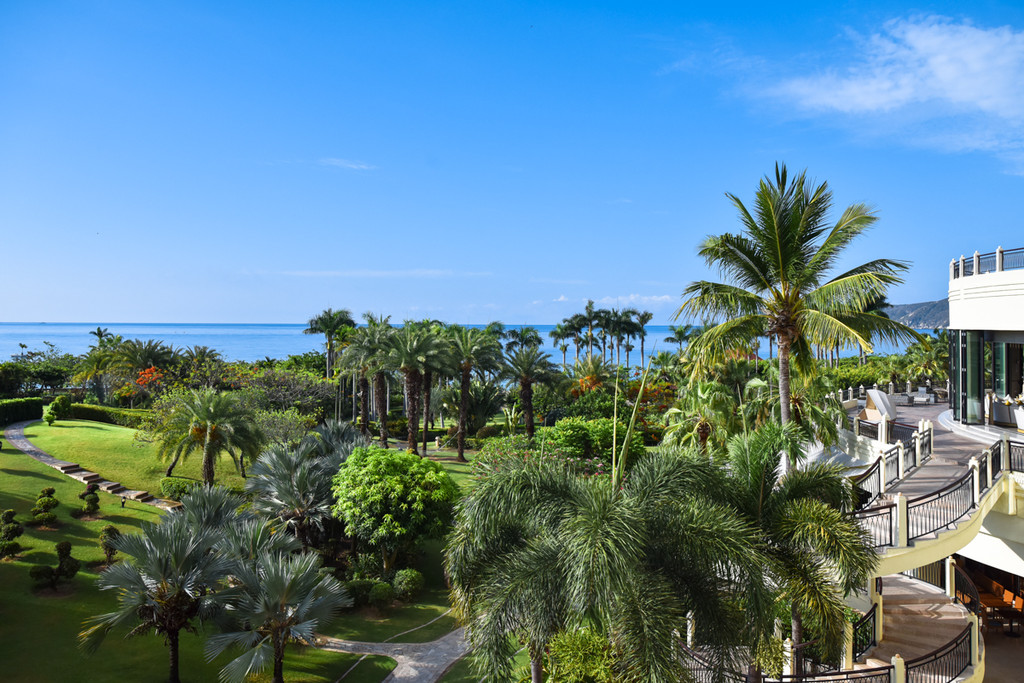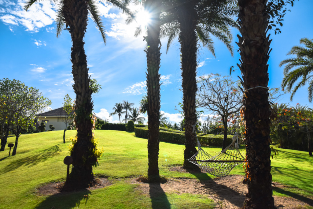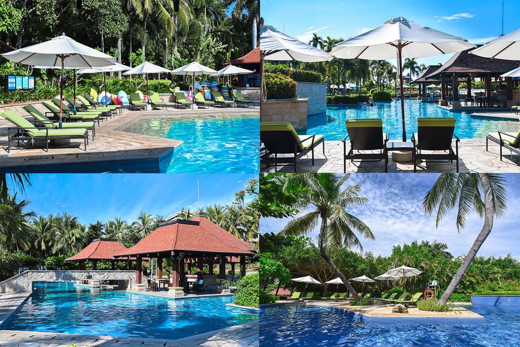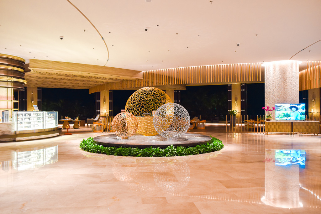 也正因为出色的国际设计团队,酒店的热带园林景观设计,非常原生态、天然。高低错落有层次,从中央草坪到西侧阶梯式的泳池群落,再到东侧果岭般的总统别墅&SPA水疗中心,让人百看不厌。中央草坪与主楼大堂平面,呈“8”字型,我不知是设计师有意为之,还是无意之作。海风掠过防风椰林,径直灌入大堂,让通风效果更好;这样的障景手法,也让第一次入住的客人,对大海也有了更多联想。