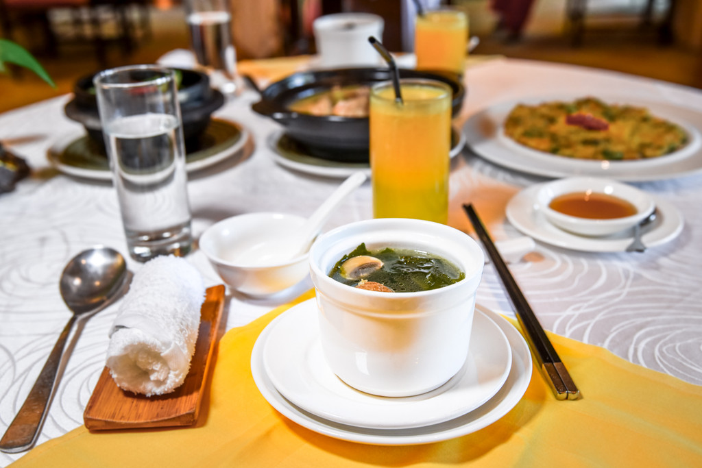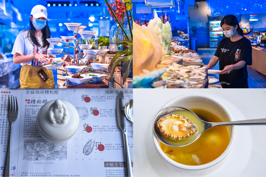 在5F『聚味轩中餐厅』,5月10日也推出了三亚少有的正宗粤式早茶,虾饺、凤爪、烧卖、排骨等等,你若喜欢,必然有你所想。如果恰巧你的客户是广东人或是喜爱广式早茶的。自然少不了聚味轩的Yum Cha=饮茶啦!只要88一位,真心超值!当然为了更好满足商旅、度假人群,正餐还有更超值套餐之选,我推荐B。黄豆炖排骨、脆皮文昌鸡、椒盐海虾、蒜蓉蒸鲜鲍、酱椒蒸海鲳、辣炒海螺,再来一碗海南后安粉作主食,也是不错的。你猜价格如何?