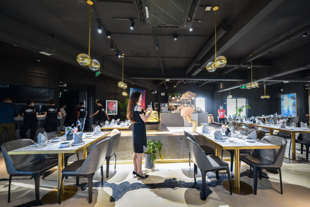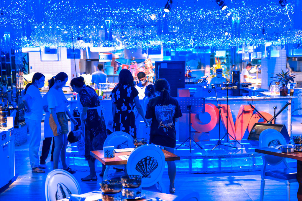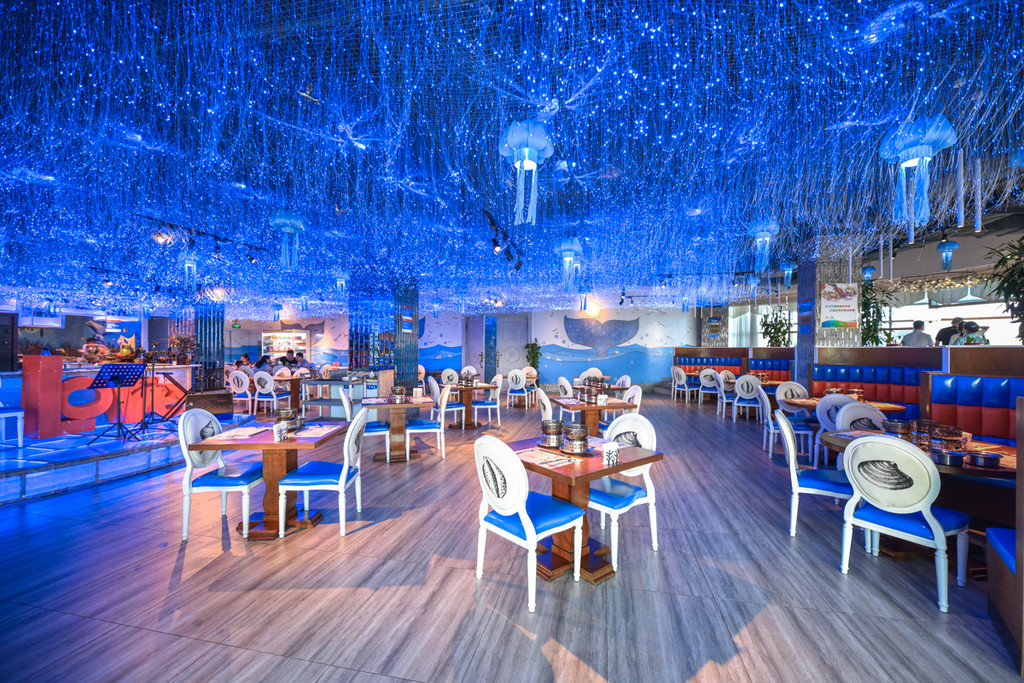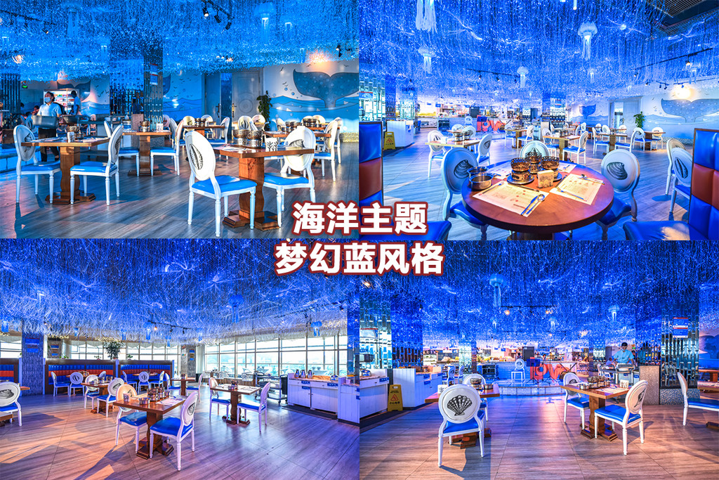 餐厅主打海洋主题,从logo和灯光色调、餐厅设计风格来看,就很让人期待。和很多网红玻璃照相房很像,神秘蓝,梦幻蓝,本就容易让人产生平静的感知。所以,氛围非常适合吃货。