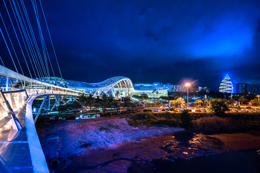 如果你第一次来三亚免税城,一定要详细了解平面地图,因为楼层与建筑之间有很多店,会容易走错。当然啦,买完可以机场提货退税,或者自己带走都行。夜幕下,免税城二期的卫星塔是很梦幻的!这座天桥桥体呈波浪形,平面岔开,一侧到达负一层,一侧到达一层。