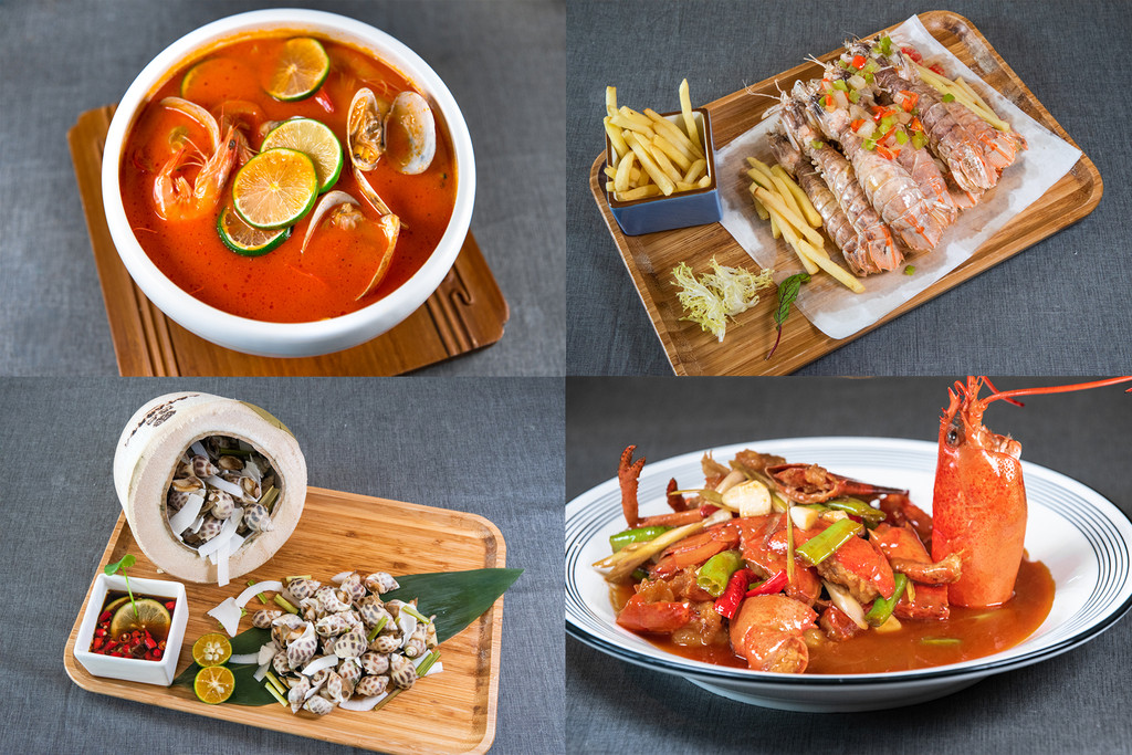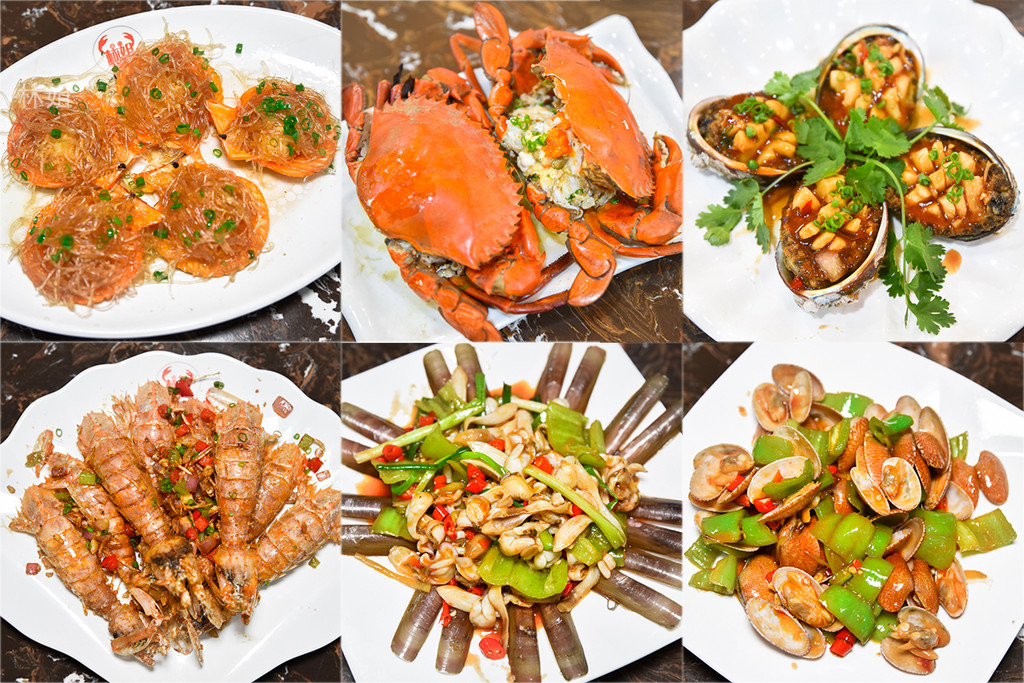 环境看起来还不错,挺舒服。很适合大快朵颐的吃大餐。在池子上方有推荐菜式,有三亚十大名菜“椰香花螺”、食神最爱“吮指皮皮虾”、东南亚风味的“暹罗龙虾”、最新出品的“游龙戏水老虎斑”....光听名字就很饿了!还有粤菜港式避风塘炒蟹、水妈妈海鲜冬阴功,这几个菜,可叫人垂涎三尺,全三亚这样的菜很少啊。
