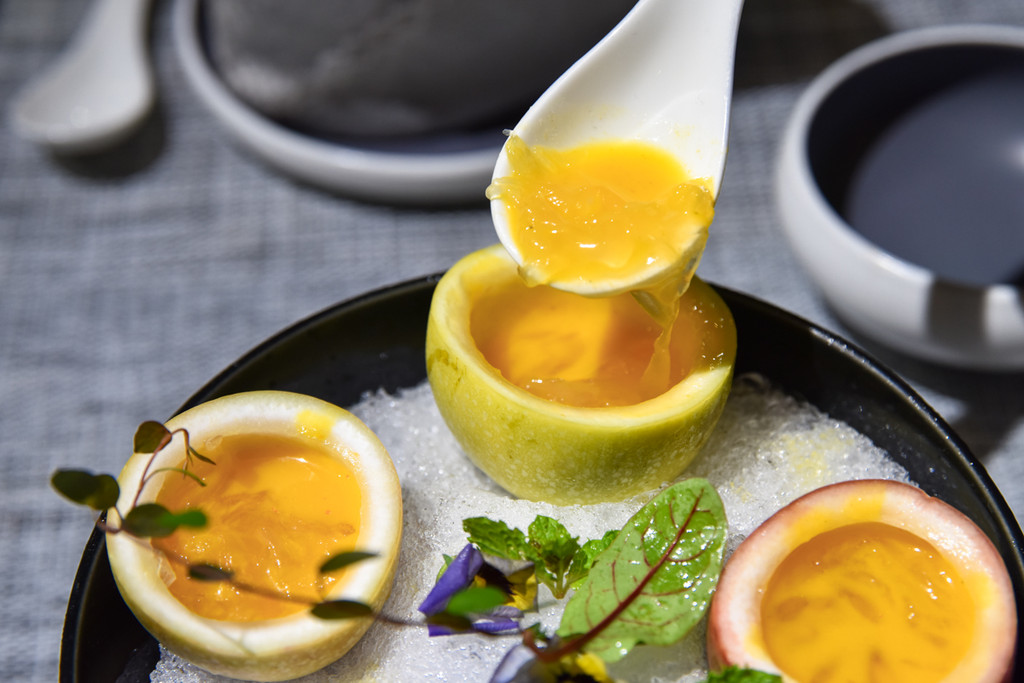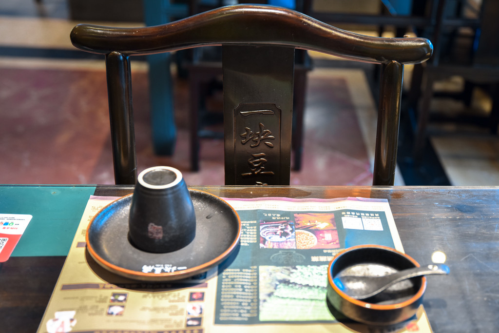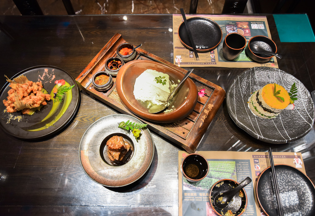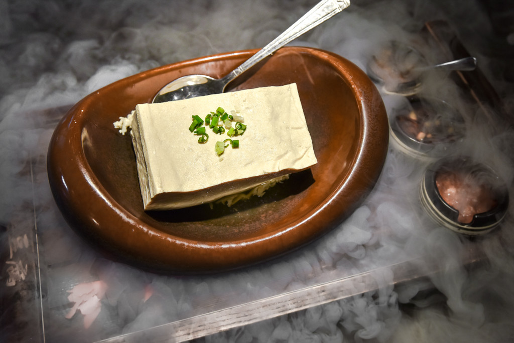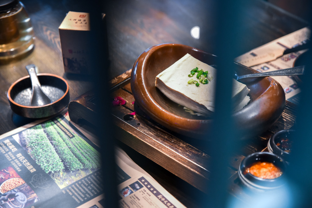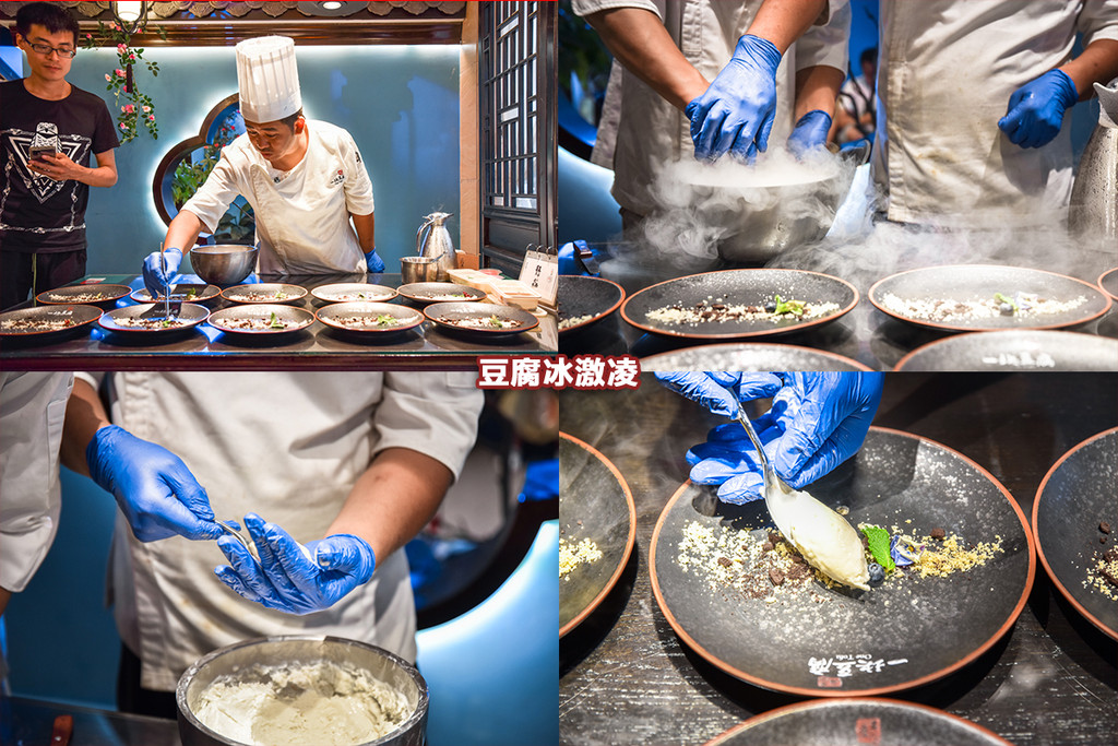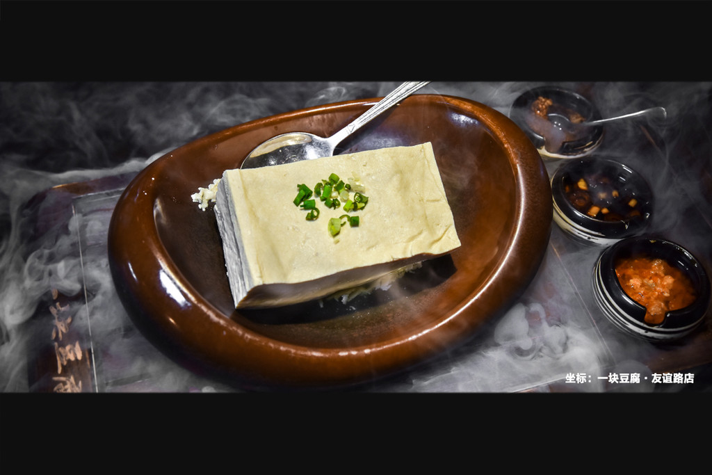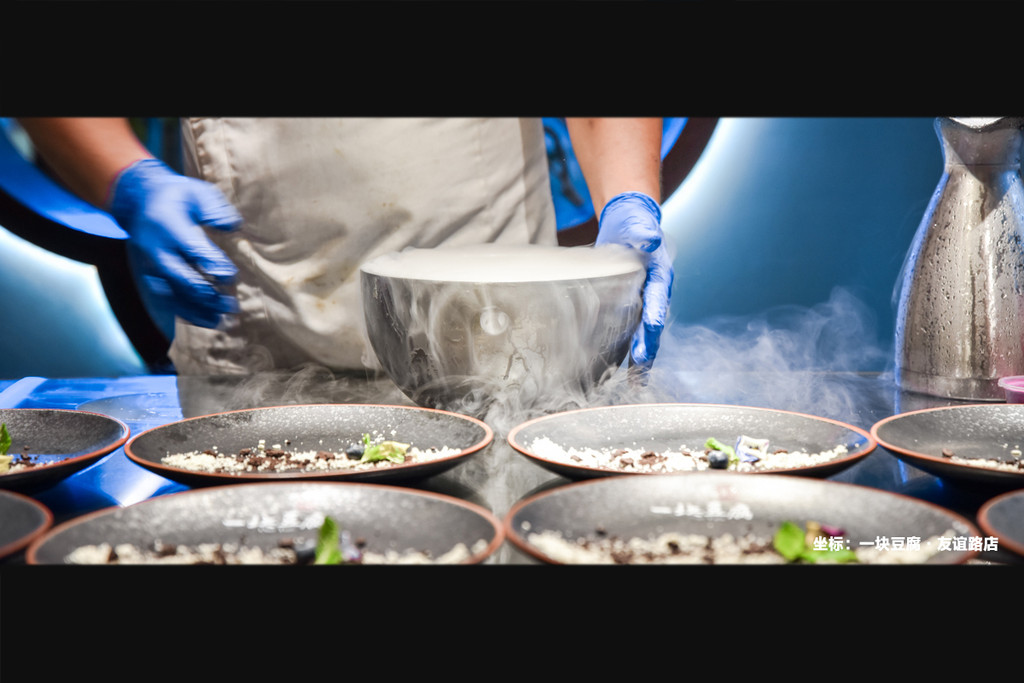 入口即化,满口豆香。咀嚼之余,还有豆腐的口感。摆盘不错,造型别致,就是小了点,想吃,没了!这会菜品上齐了。快看——一块豆腐,必点。从黄豆到豆腐制作是最大视觉亮点,极尽手工本味。盛在元宝状碗中,配以黄灯笼辣椒酱、豆瓣香菇酱等,各取所需。石磨豆腐口感有咀嚼感,豆香浓郁。在食用前,淋入液氮,雾气缭绕,颇有仪式感。你可以请侍卫为你调制口味。