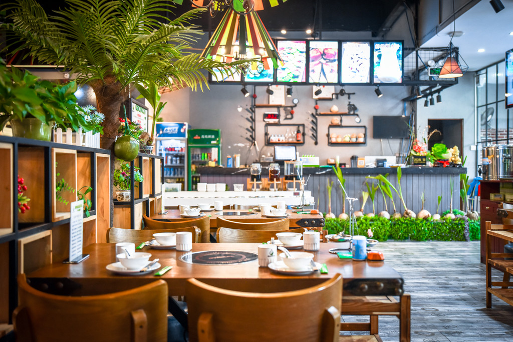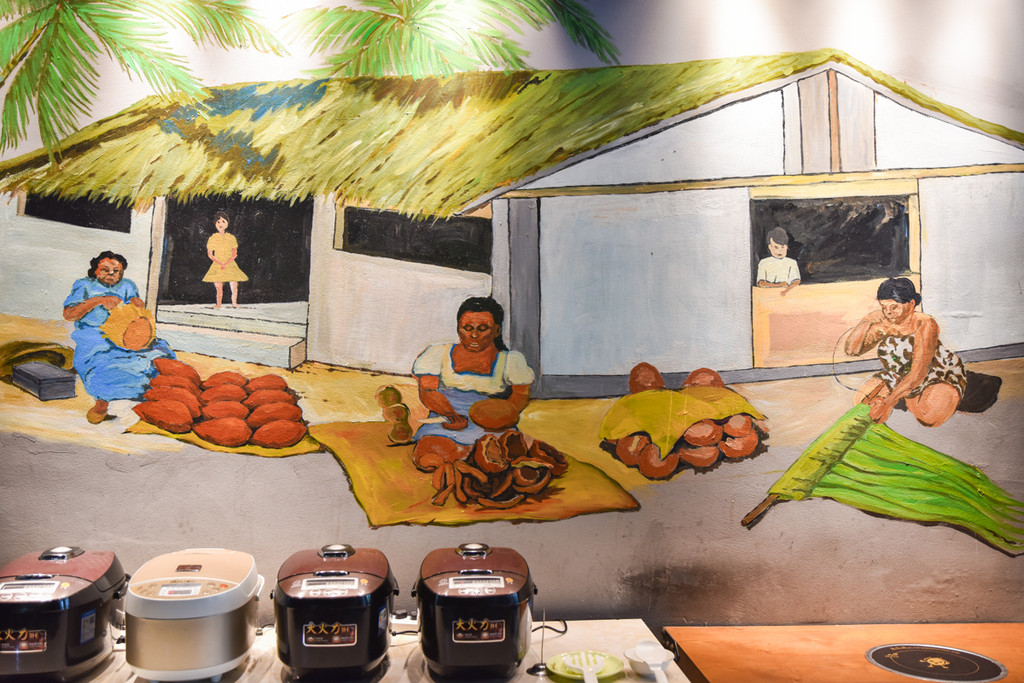 餐厅最受欢迎的餐位是落地窗卡座、吧台前座位,这才是热带海岛特色餐厅。除了卡座,还有圆形圆桌。墙面上的手绘,讲述海南传统黎族人与这道菜的历史文化。