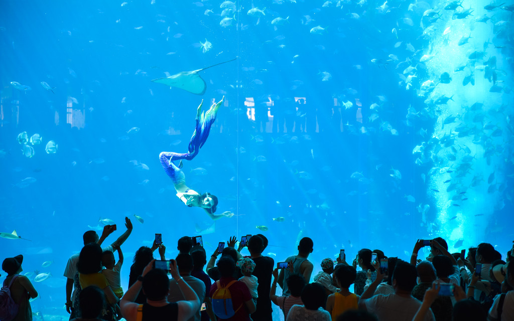 在特定日期的中午,大约11点,位于奥西亚诺餐厅门口巨大的玻璃幕墙前,会有美人鱼演出!来往酒店的客人免费观看。