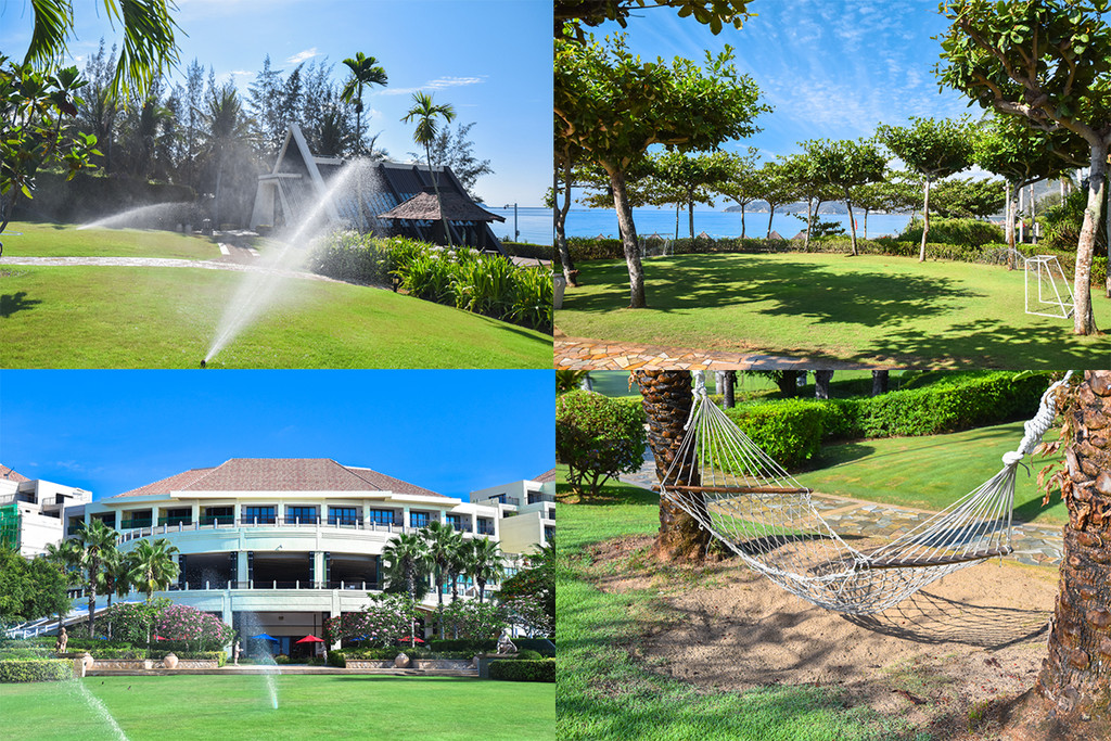 沙滩平缓、波浪轻慢,全年来讲都很适合下海嬉戏。从A座客房出来,电梯直达1楼,或从2楼翡翠阁沿着旋转楼梯下楼,走过软软的中央草坪,海风拂面,这种惬意,真是的别人羡慕的样子!偶尔回眸,喷淋花洒经过的地方,阳光与水花织起一缕缕彩虹,海鸥时不时停落在椰林间漫步。这样的景致并不是每一家酒店都有。