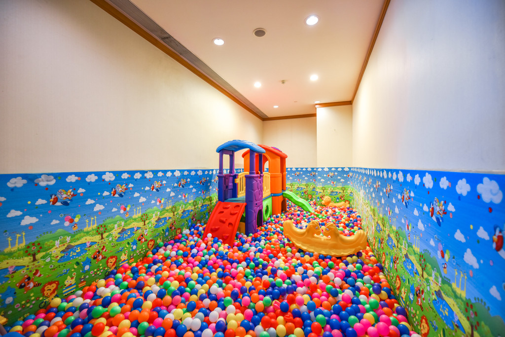 酒店建立之初,由于地势特点,所以一楼空间较小,前台设于二楼,但是一楼功能分区却很多;室内亲子乐园、室外泳池群、亲子沙地等,满足了亲子家庭所需。