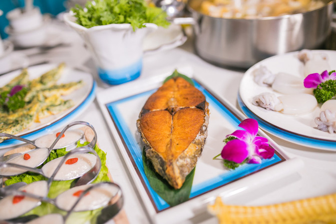 餐厅分为海鲜区、热菜区、冷菜区、烤物区、甜品区、水果区、酒水区、明炉区、汤品区,取餐的地方很集中,9大档将近200款美食也是应有尽有!