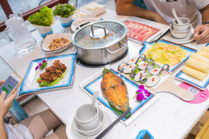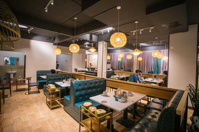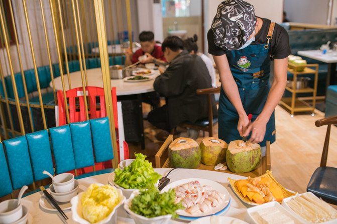 走进萌哒哒椰子鸡,发现它以现代风格装修、海岛原生态元素点缀的布置环境静谧、风格雅致,白色花纹大理石桌面、海蓝色沙发卡座、藤编吊灯等增添不少风情,原来椰子鸡火锅店的环境也可以如此小清新呢!