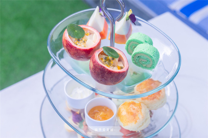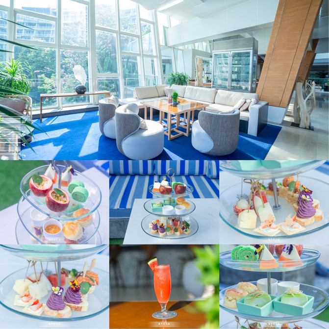 我是冲着大堂吧的特色下午茶而来的,三层甜品塔由木瓜奶冻、五指山绿茶蛋糕卷、香兰椰子蛋糕、热情芒果布丁、苹果杏仁酥、椰子司康配奶油果酱、缤纷三明治、紫薯脆片、芒果大虾组成,享受一个惬意的下午so easy~