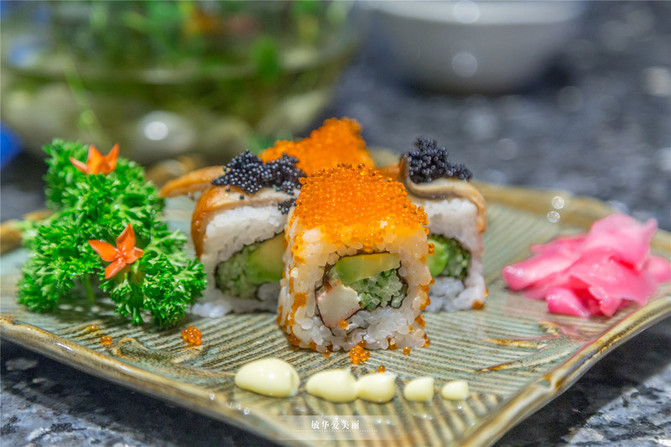 蟹籽蟹柳牛油果加州卷,牛油果搭配着蟹柳在口腔内演绎着缠绵悱恻,蟹籽在咬破的那瞬间爆裂,增加不少口感。