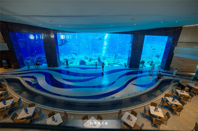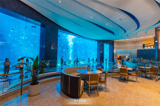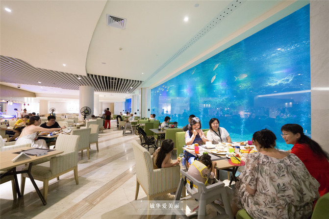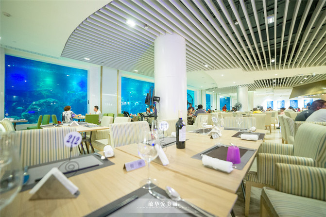 餐厅最特别的地方,就是有一面墙完全是水族馆一样的海底世界玻璃窗,超大幅玻璃幕墙将海底世界的斑斓景观尽显眼前。