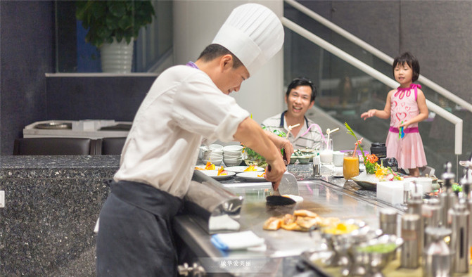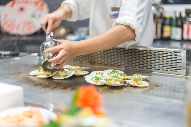坐在铁板烧餐桌前,可以一边观看厨师精湛的烹饪表演,又可以品尝新鲜热辣的美食,视觉与味觉的双重享受。