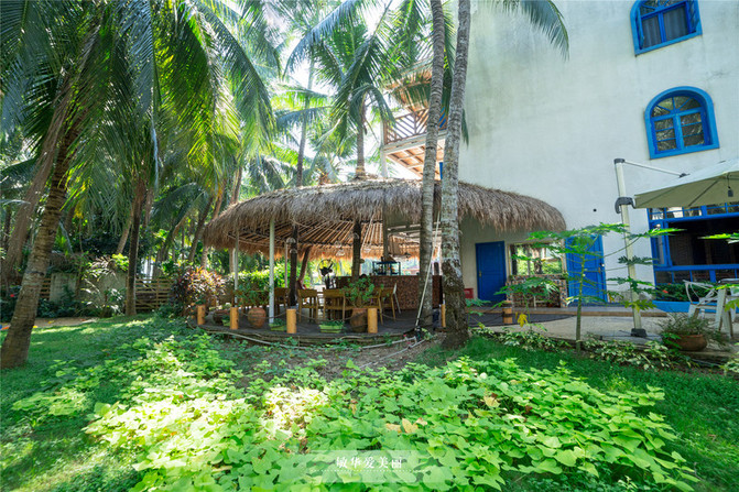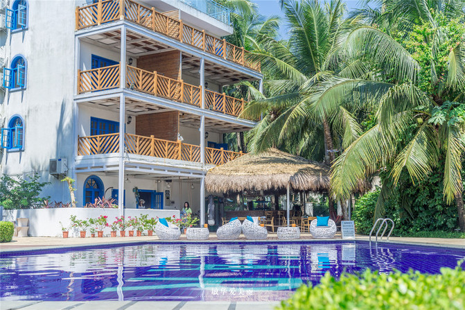 比邻美宿位于海棠湾藤桥镇海丰村内, 蓝白色结合的地中海风情很符合我的胃口。