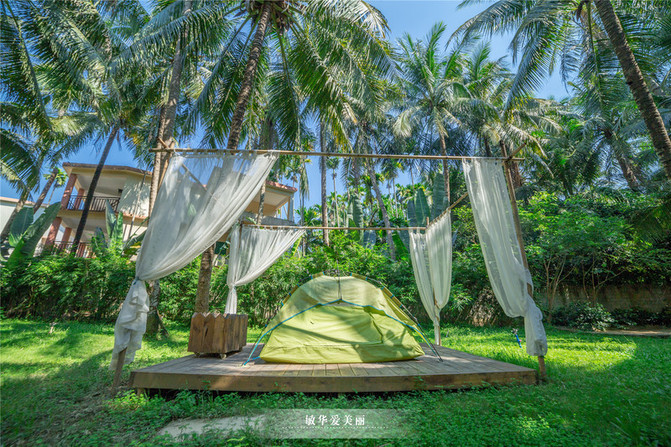 阳光穿透过草地和椰林,在草地上还有两个可爱小帐篷,女汉纸小朋友喜欢到不行!