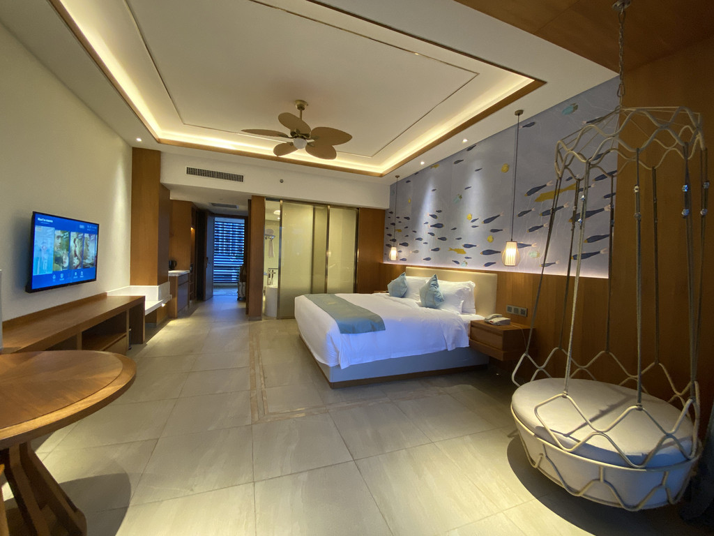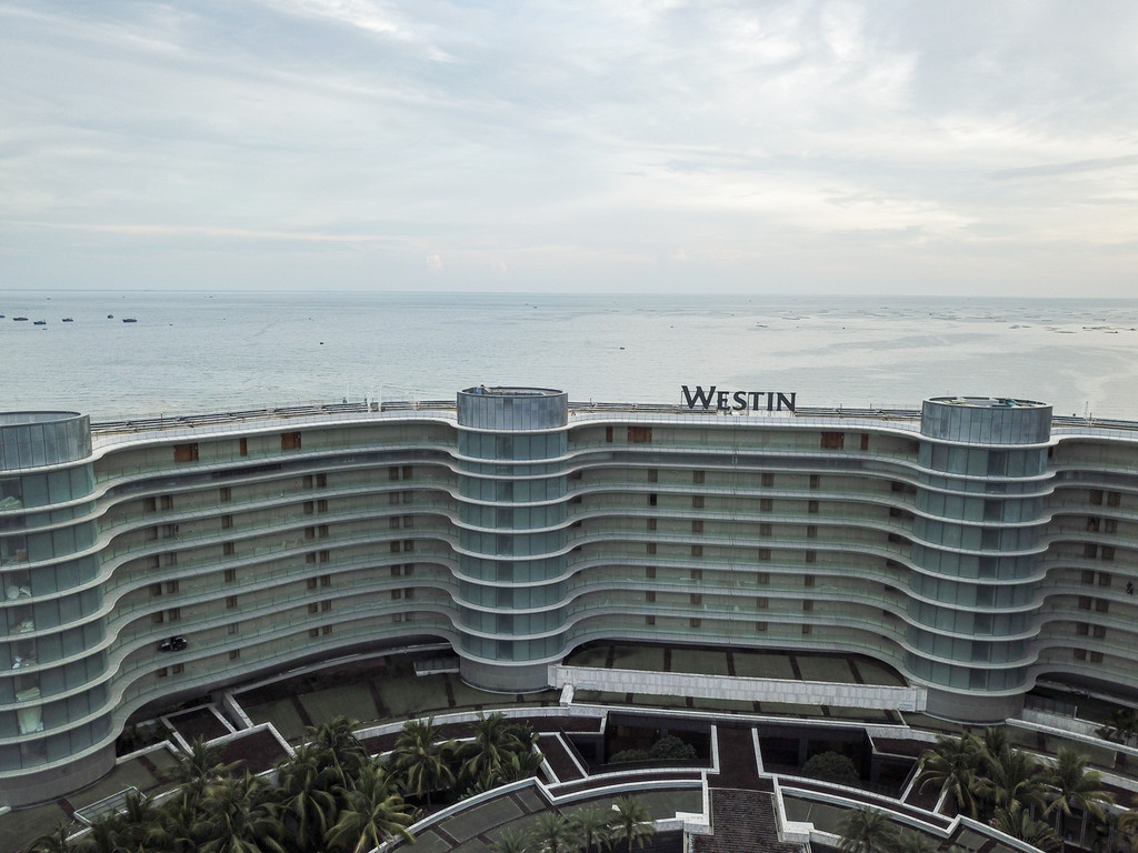 吃过晚饭,我们入住了陵水清水湾威斯丁酒店。从外观上来看,酒店如同一条抖动的波浪。宽阔的墙体摆动身姿,倒也是无比浪漫。夜幕降临,灯光点亮。玻璃幕墙之后,那是无数条灯线在流窜。