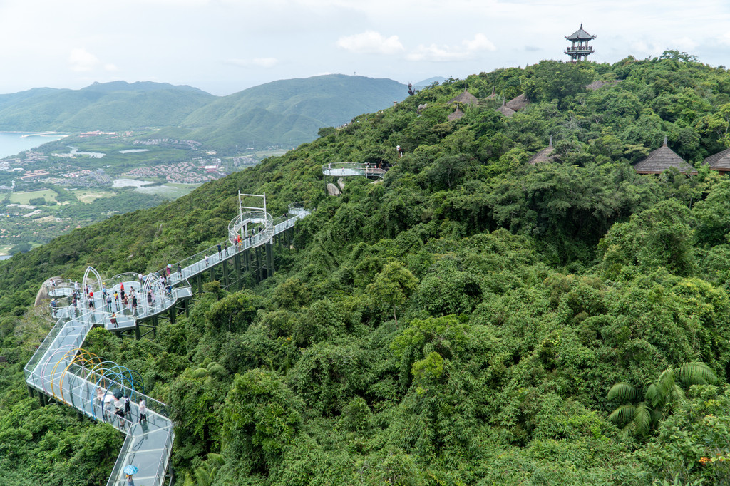 坐景交车上到山顶的观景平台,大家会发现这里是俯瞰亚龙湾的最佳观赏地,连航拍也省了。亚龙湾是国际知名的海湾港口。这里设施齐备,服务一流。从这里度假归来,那绝对是朋友圈炫耀的资本。值得一提的是,森林公园也是《非常勿扰2》的拍摄地点。