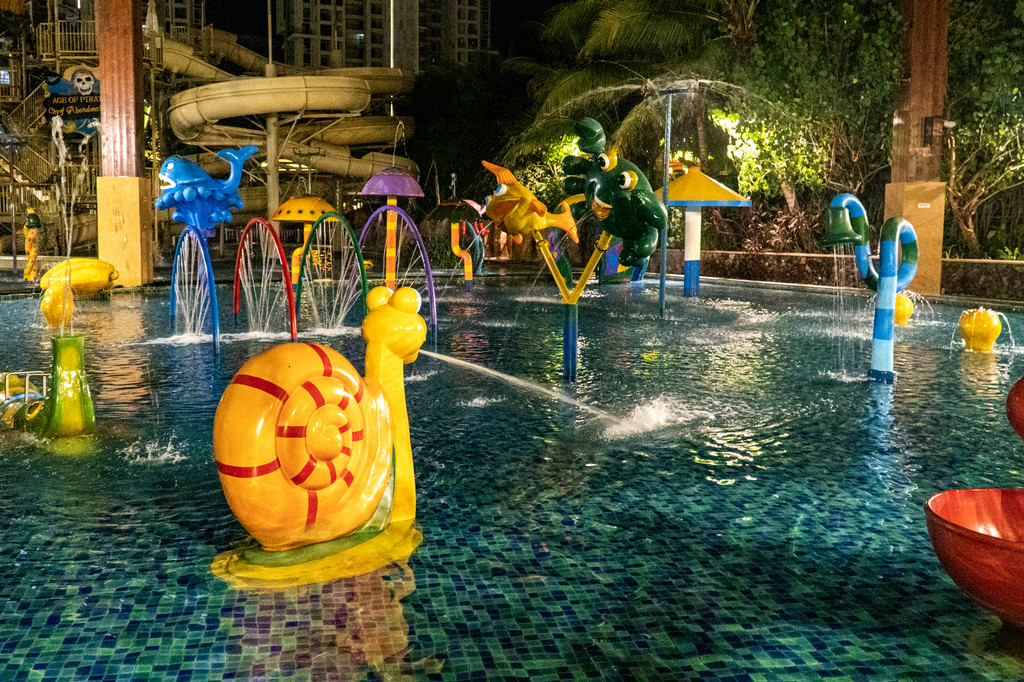 等到夜晚降临,红树林酒店终于展现出真正的魅力。五光十色,光彩耀眼。优美的弧度在空中划出,曲线灵动悠然。四周一片寂静,玻璃折射,光彩缤纷。在正中心,皇后棕最吸人眼球。高耸大气,直插云霄。入住酒店还会送两张水上乐园的门票,可以尽情享受清凉世界。