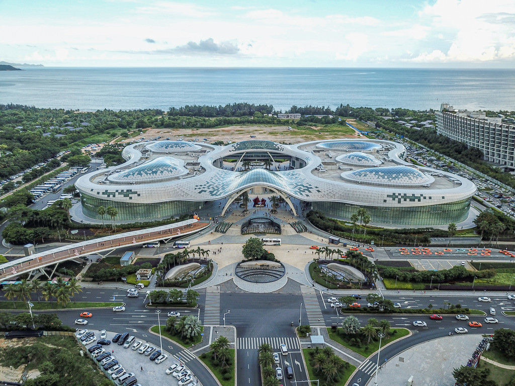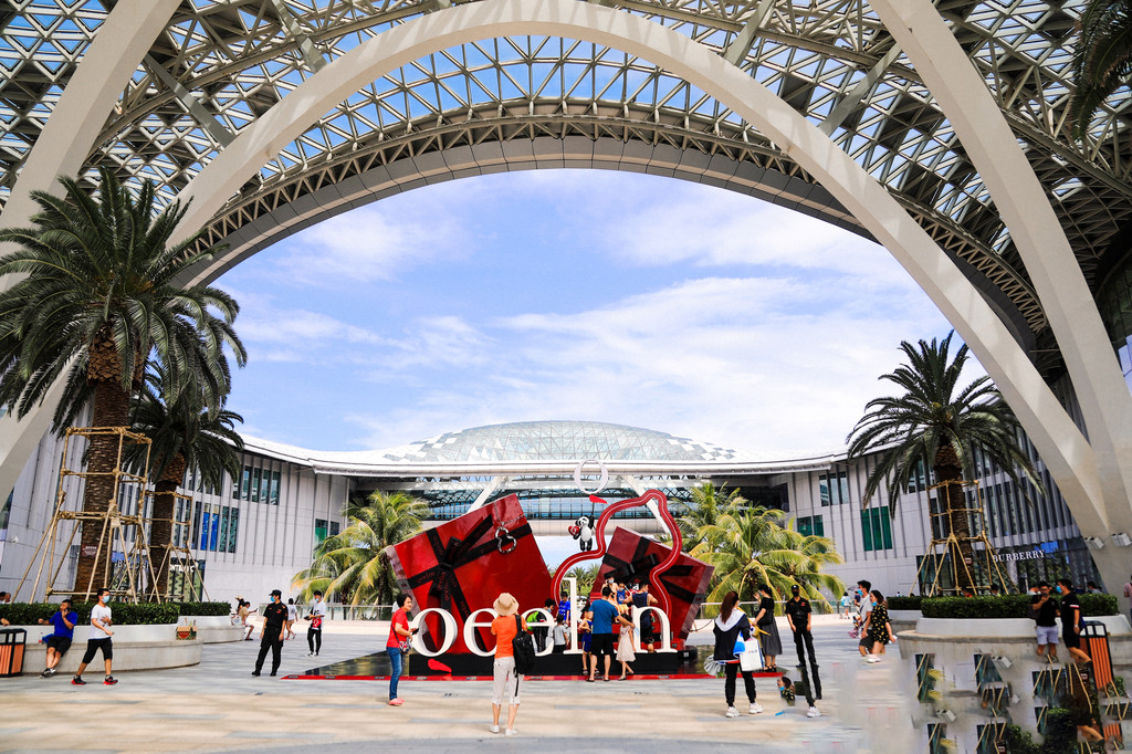 从外面看去,免税商城大气明亮。超大的占地面积和无与伦比的设计吸引眼球。作为东方海岛的形象,它确实非常争气。四面通透,浑然一体。曲线设计,无比灵动。优美自然,深入人心。在周围,绿树葱茏,海风轻拂。不远处,商城正面濒海眺望。夜深人静,商城内灯火通明。光彩夺目,缤纷耀眼。抬头望去,天花板不知该有数十丈那么高。玻璃嵌入,星光荟萃。