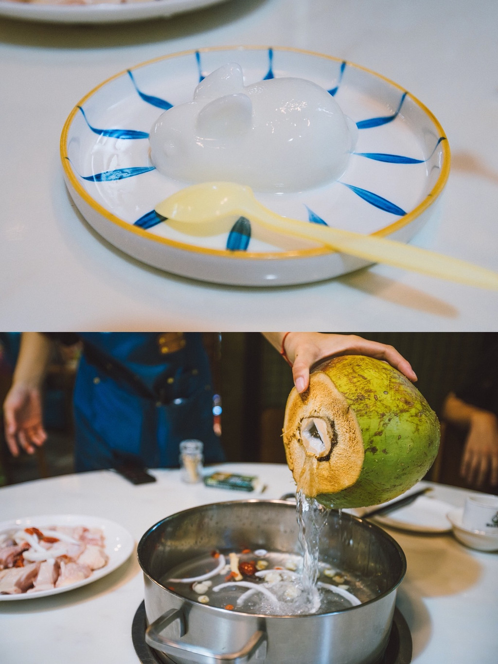 我们点的是花胶木瓜椰子鸡,虽然比原味贵一些,但是口感更好汤汁更美味、点完单过不久就看到服务员拿着三个椰子过来,现场打开出来倒入锅中,锅里已经有五指山毛桃、海椰皇、珍珠马蹄、枸杞、椰肉、红枣等食材。
