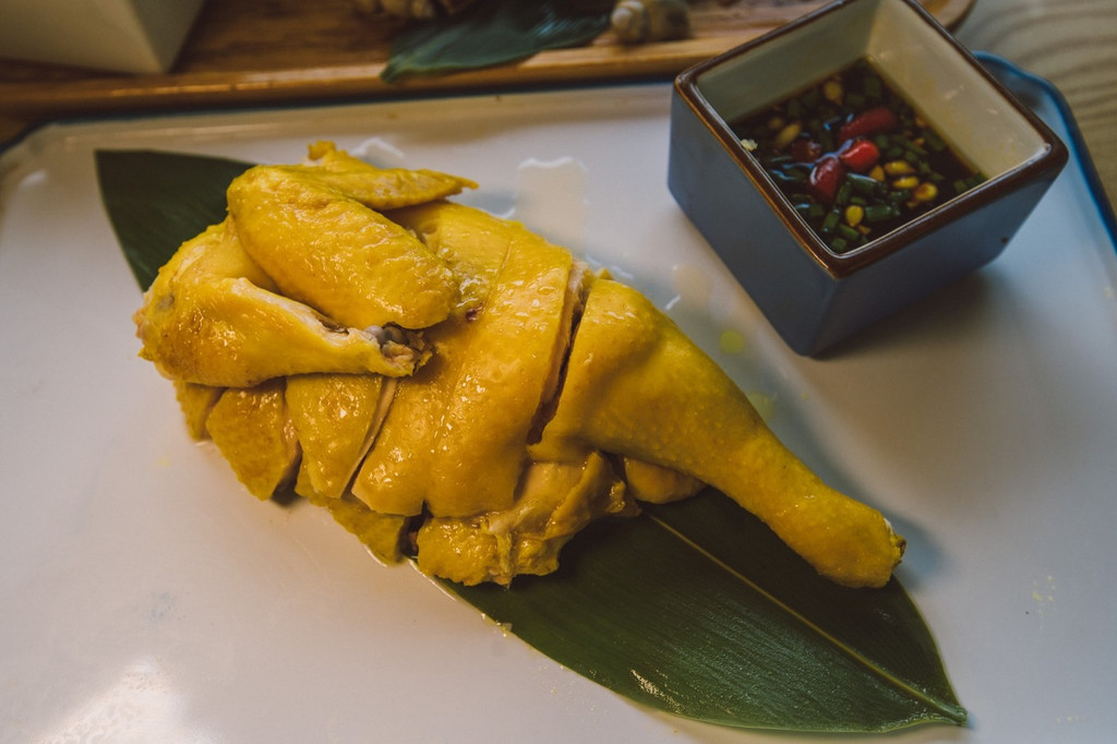 开火煮开,在放入鸡肉,这个鸡肉看着很新鲜,服务员介绍每天早上都会从 文昌 运送鸡过来,是正宗的 文昌 果地鸡,清晨宰杀,只需要煮3分钟就熟了。鸡肉口感嫩滑,可以蘸着酱料吃。