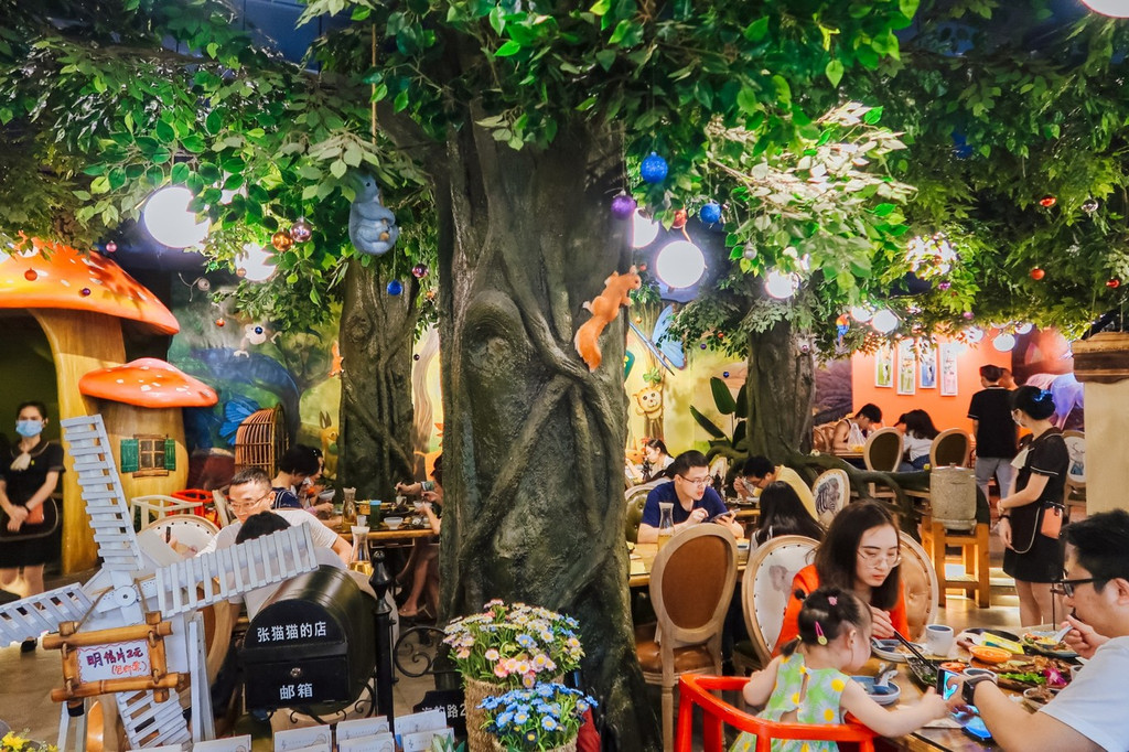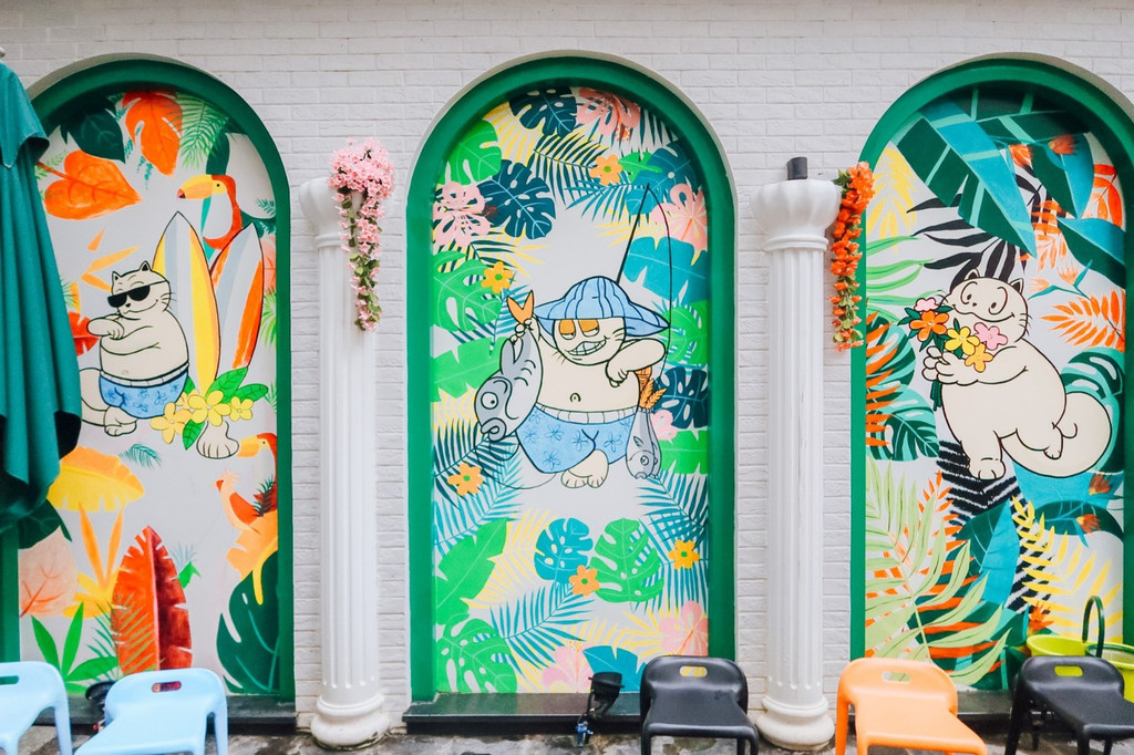 墙上有壁画、餐桌上有插花,第一眼看不出来是个餐厅,非常喜欢~
